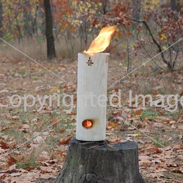 Компактное и легкое устройство представляет собой цилиндрическое полено с двумя отверстиями: вертикальным - для выхода огня, и горизонтальным - для доступа воздуха. На их пересечении в нижней части находится разжигательный брикет. После того, как вы подносите спичку, полено начинает гореть изнутри. За счет образовавшейся тяги пламя получается высоким и красивым.