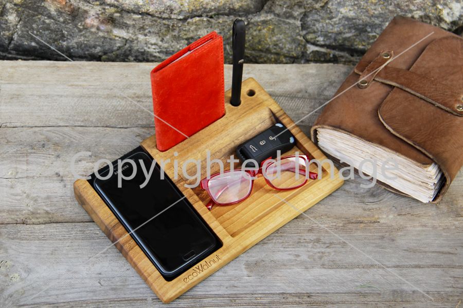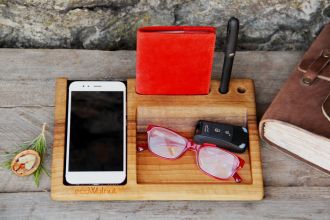 Функциями заряда аксессуар не ограничивается. В нем могут разместиться ручки, часы, ключи. Дополнительный резной паз позволит разместить телефон в вертикальном положении.