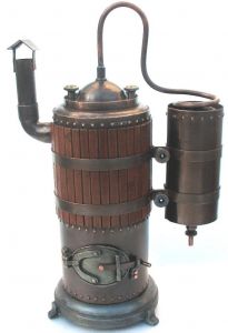 Чудо-агрегат является отнюдь не только оригинальным предметом интерьера, но еще и совершенно действующим самогонным аппаратом не в промышленным масштабах, но все же… А спиртной напиток, приготовленный в домашней атмосфере, даже полезен для здоровья! Рекомендованная загрузка – 300 мл, в качестве топлива можно использовать сухое горючее.