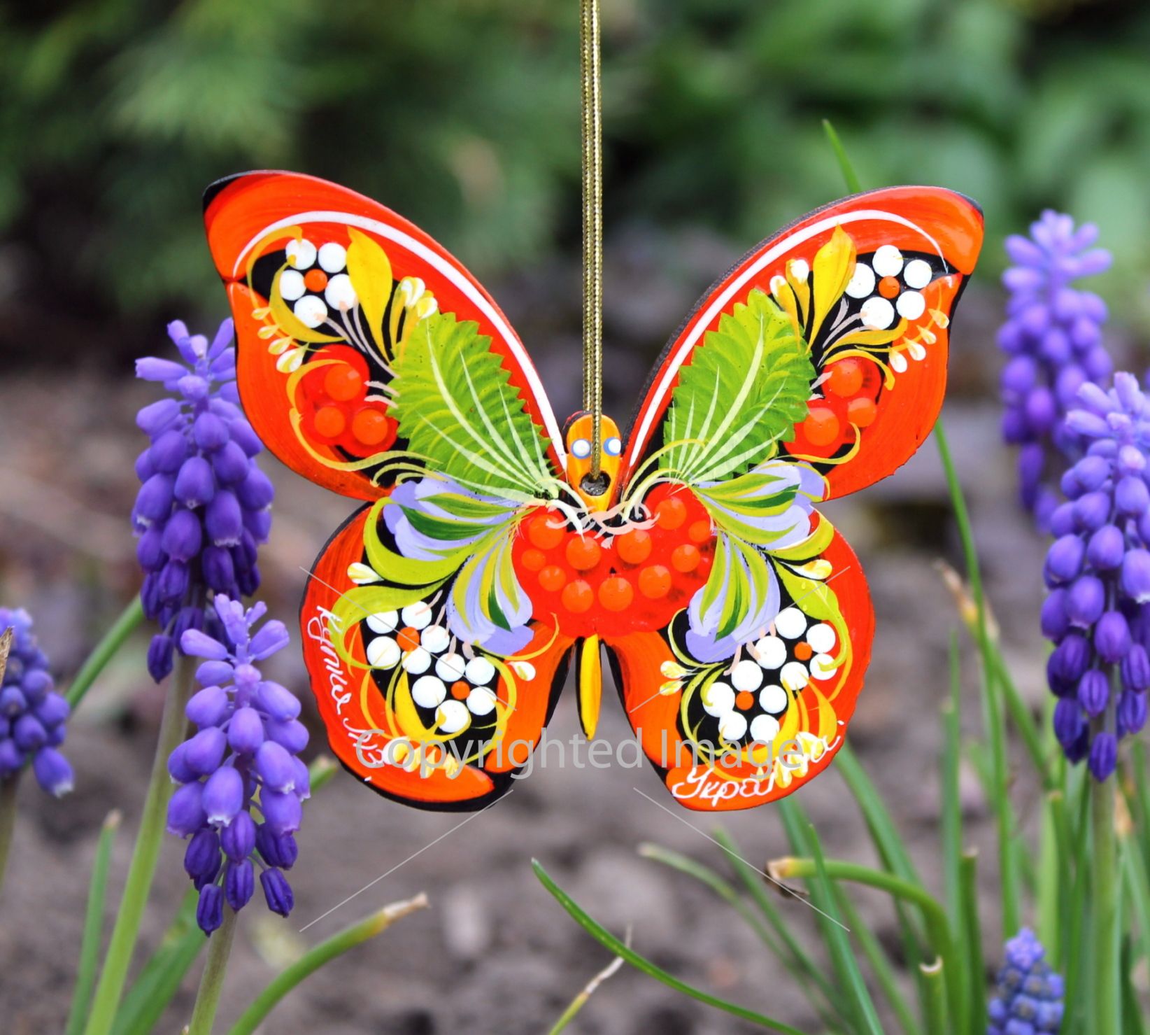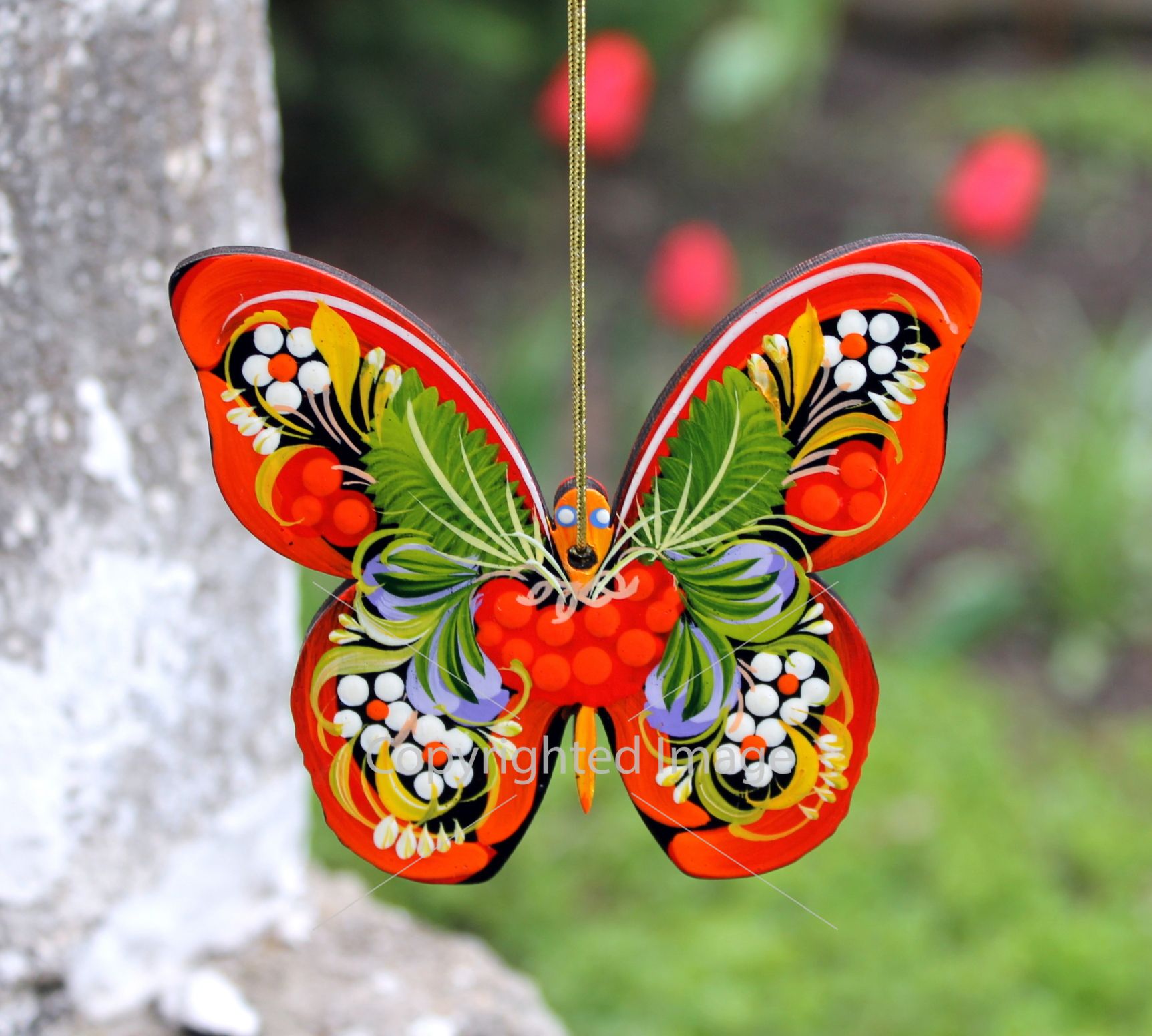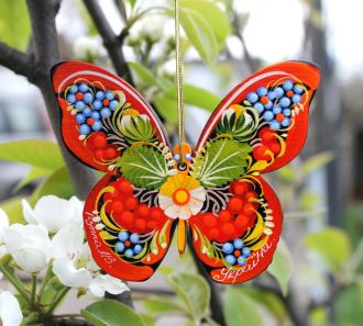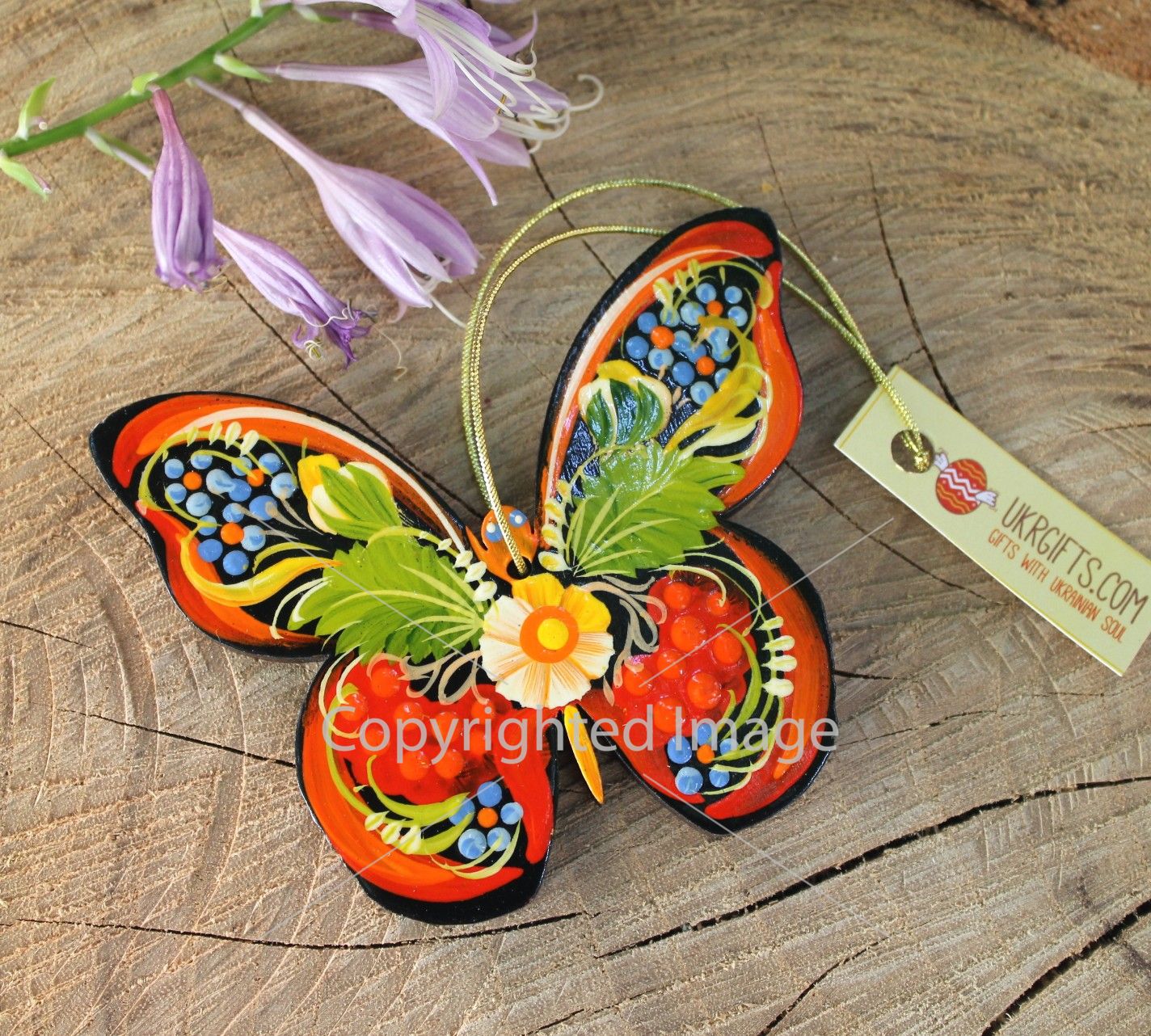 Елочная игрушка с Петриковской росписью "Бабочка" калина на черном