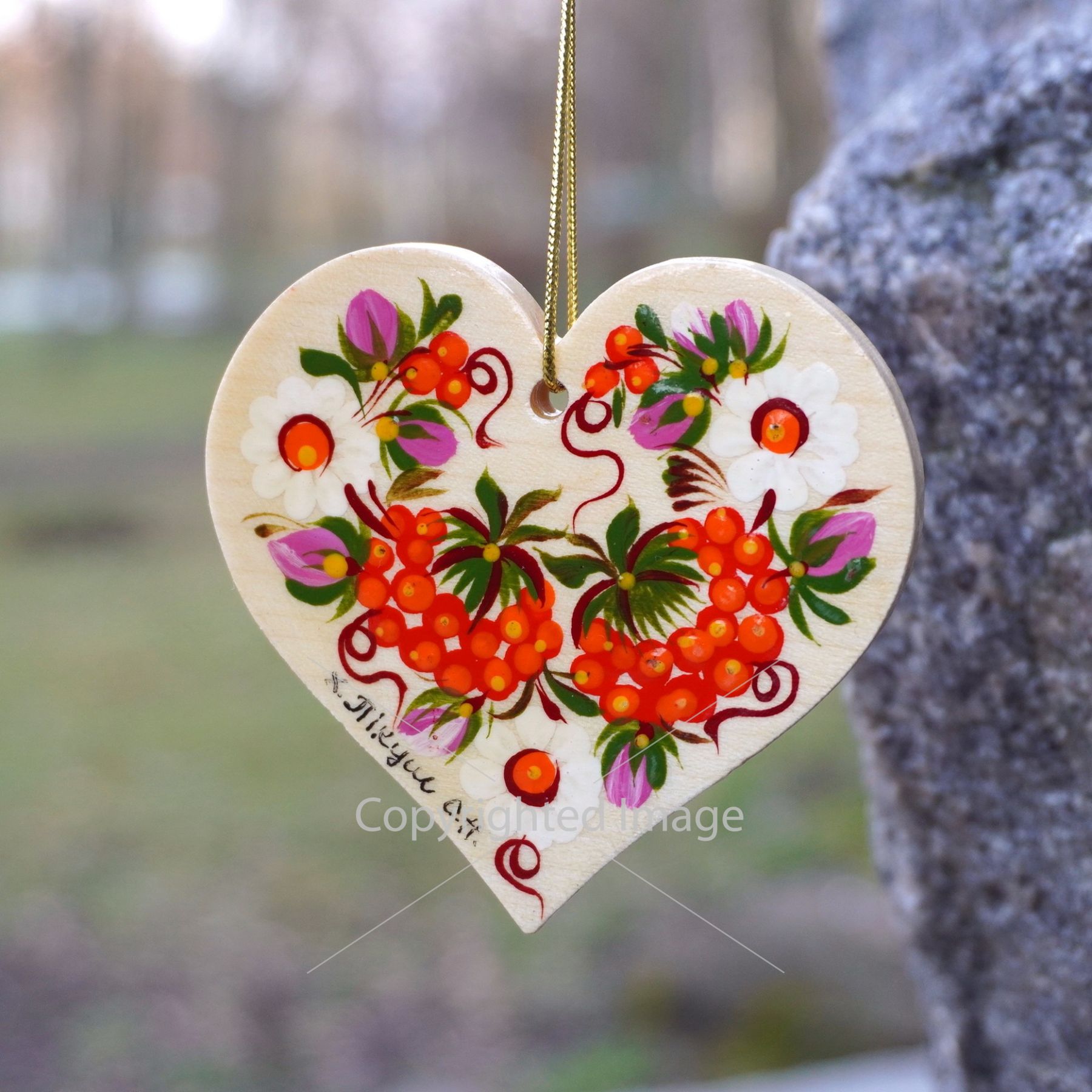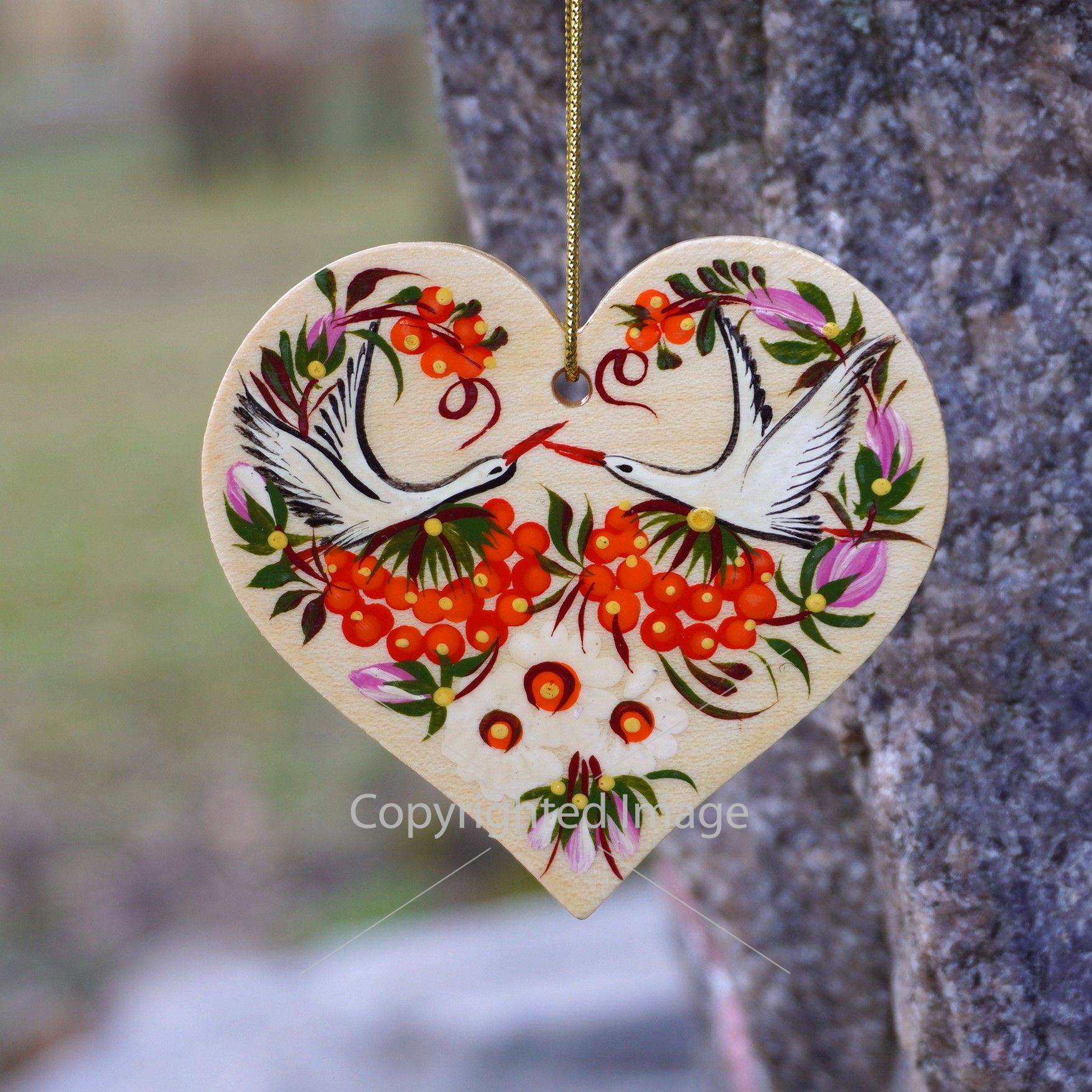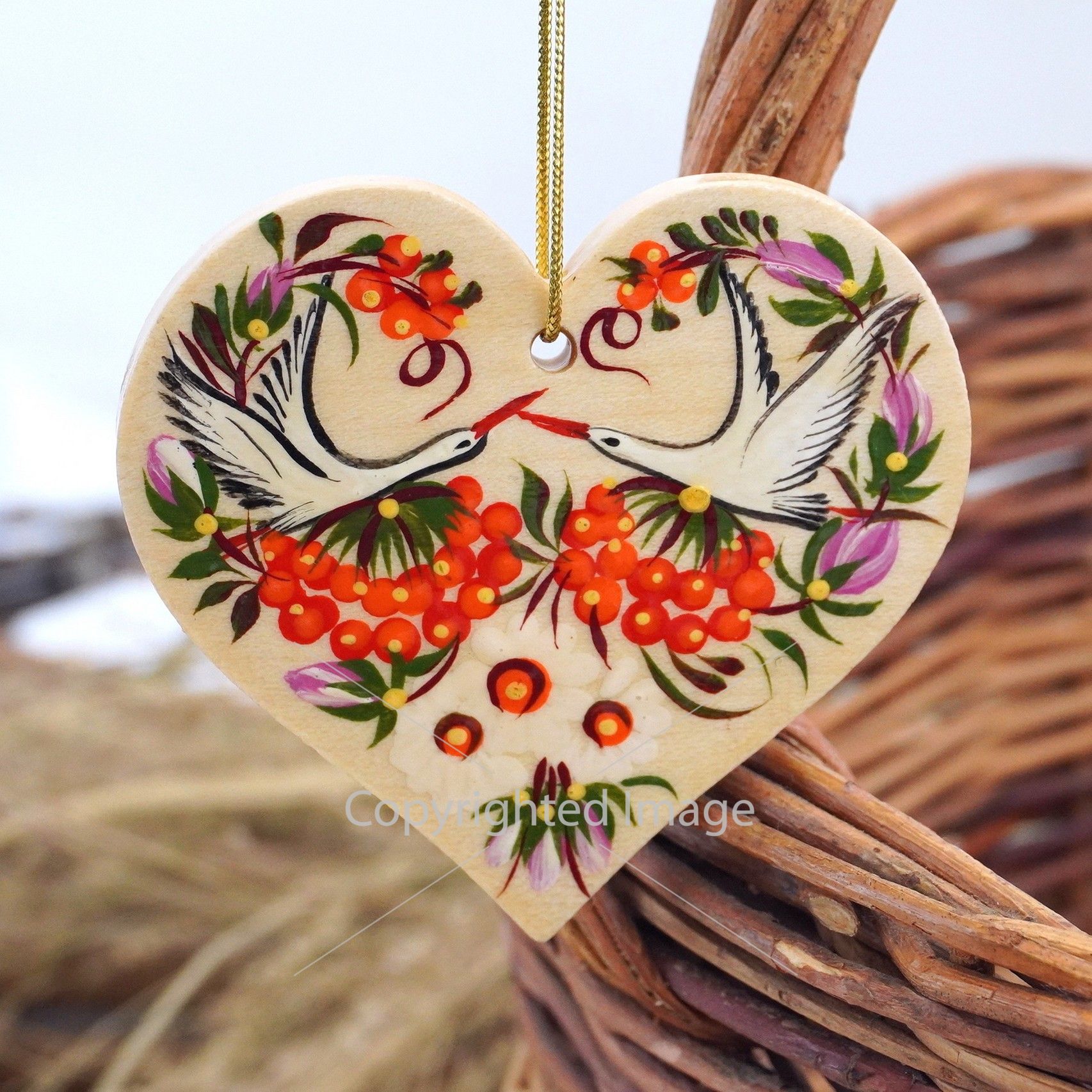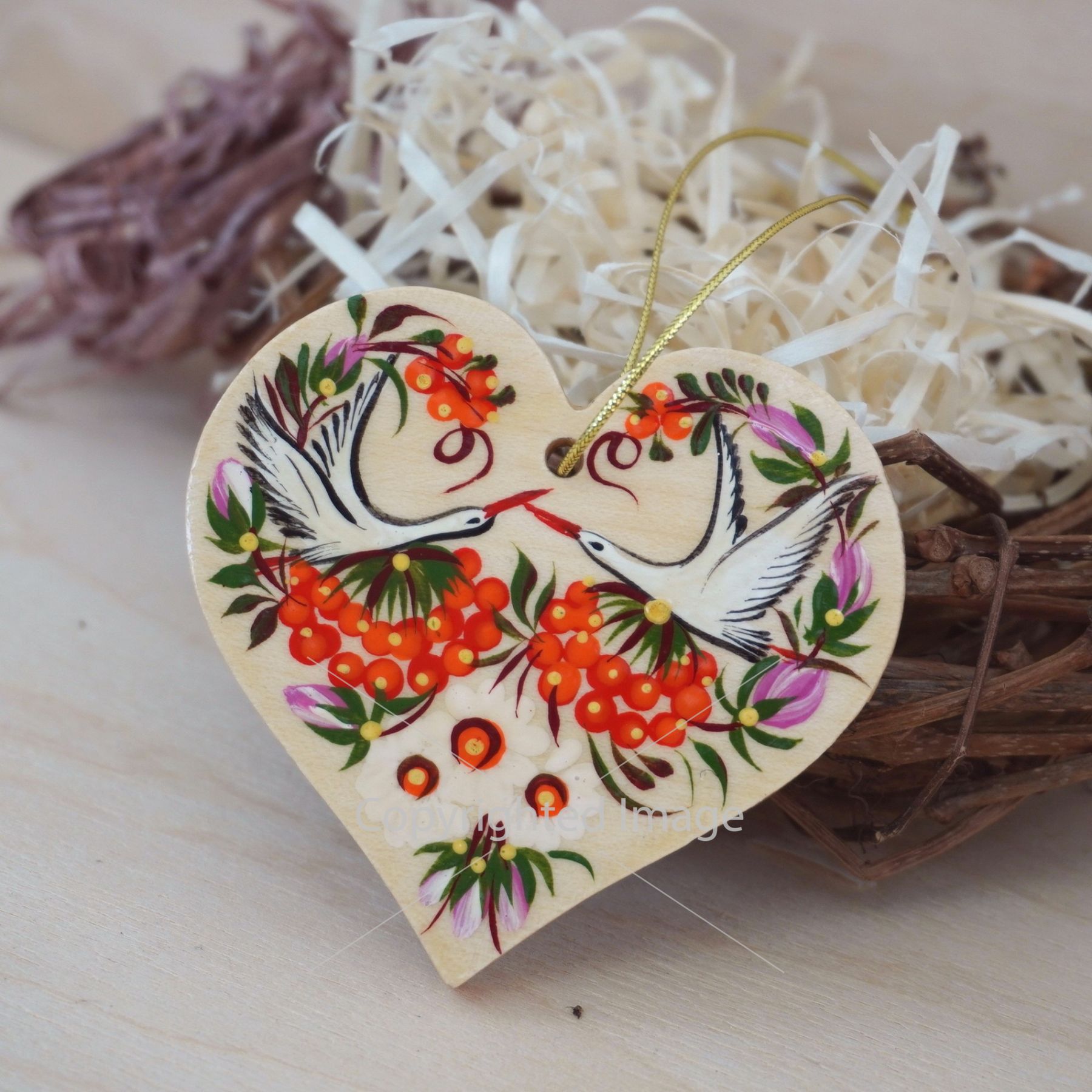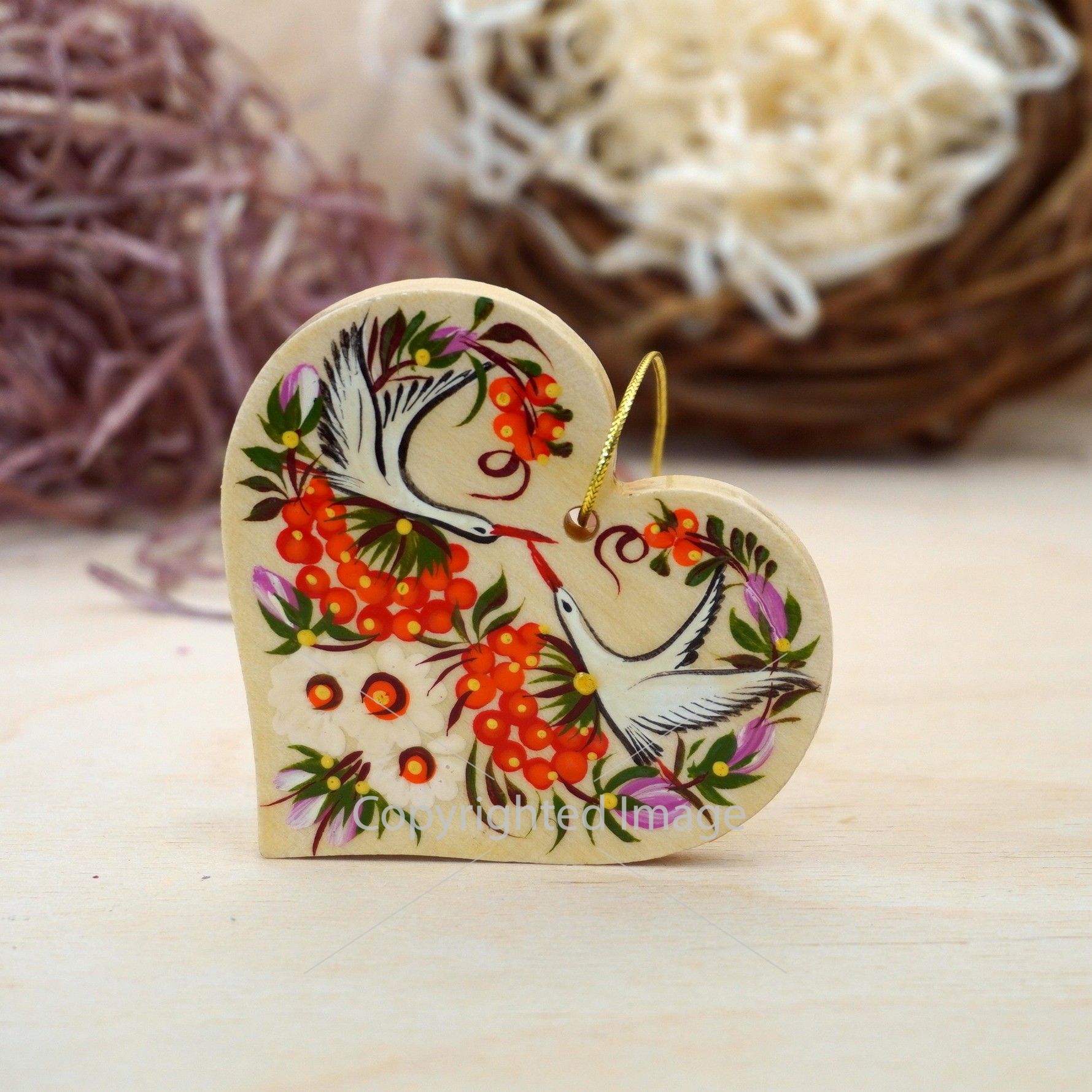 Елочная игрушка с Петриковской росписью "Сердце" поющие птицы