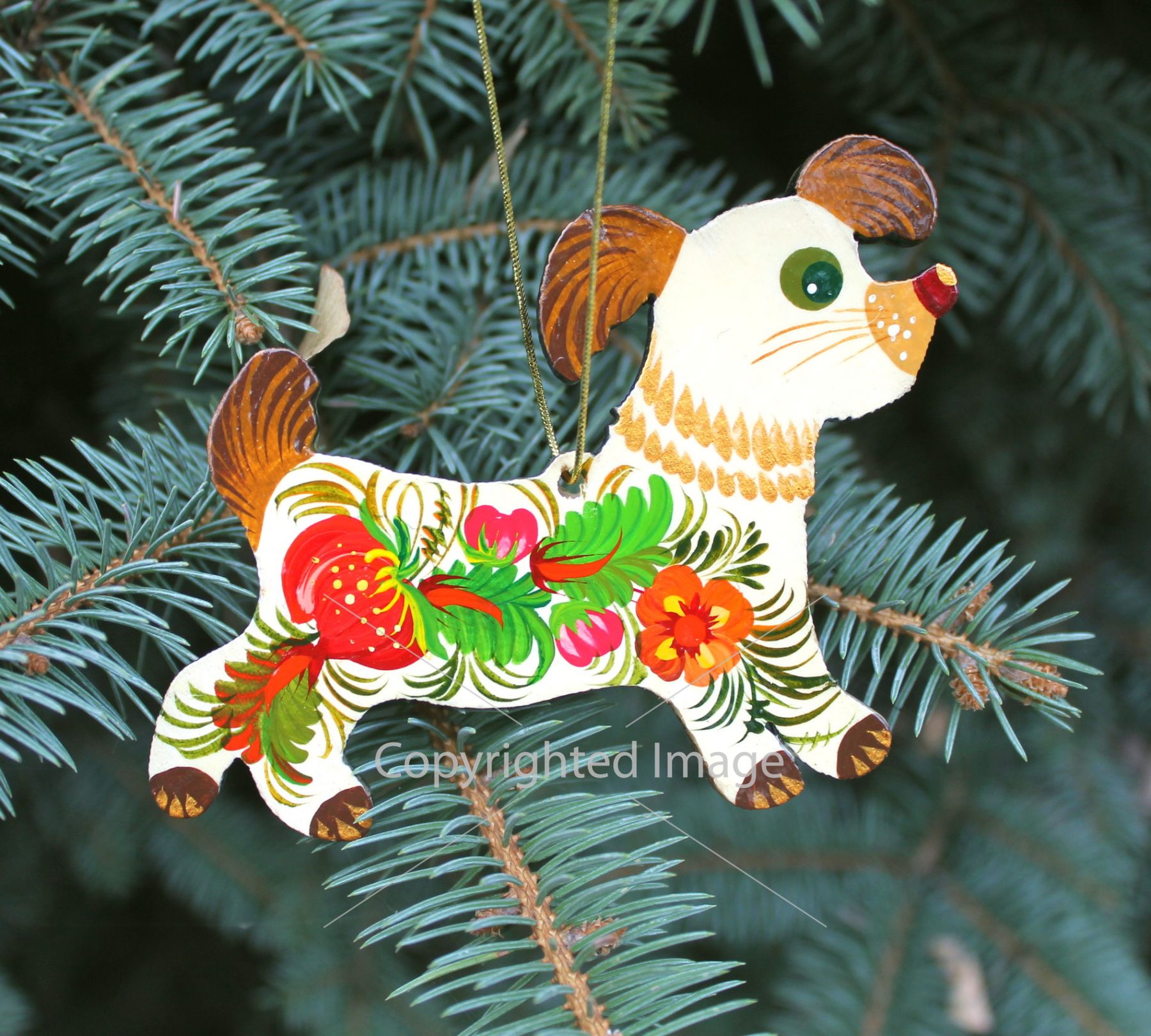 Елочная игрушка с Петриковской росписью "Собачка", цветы на белом