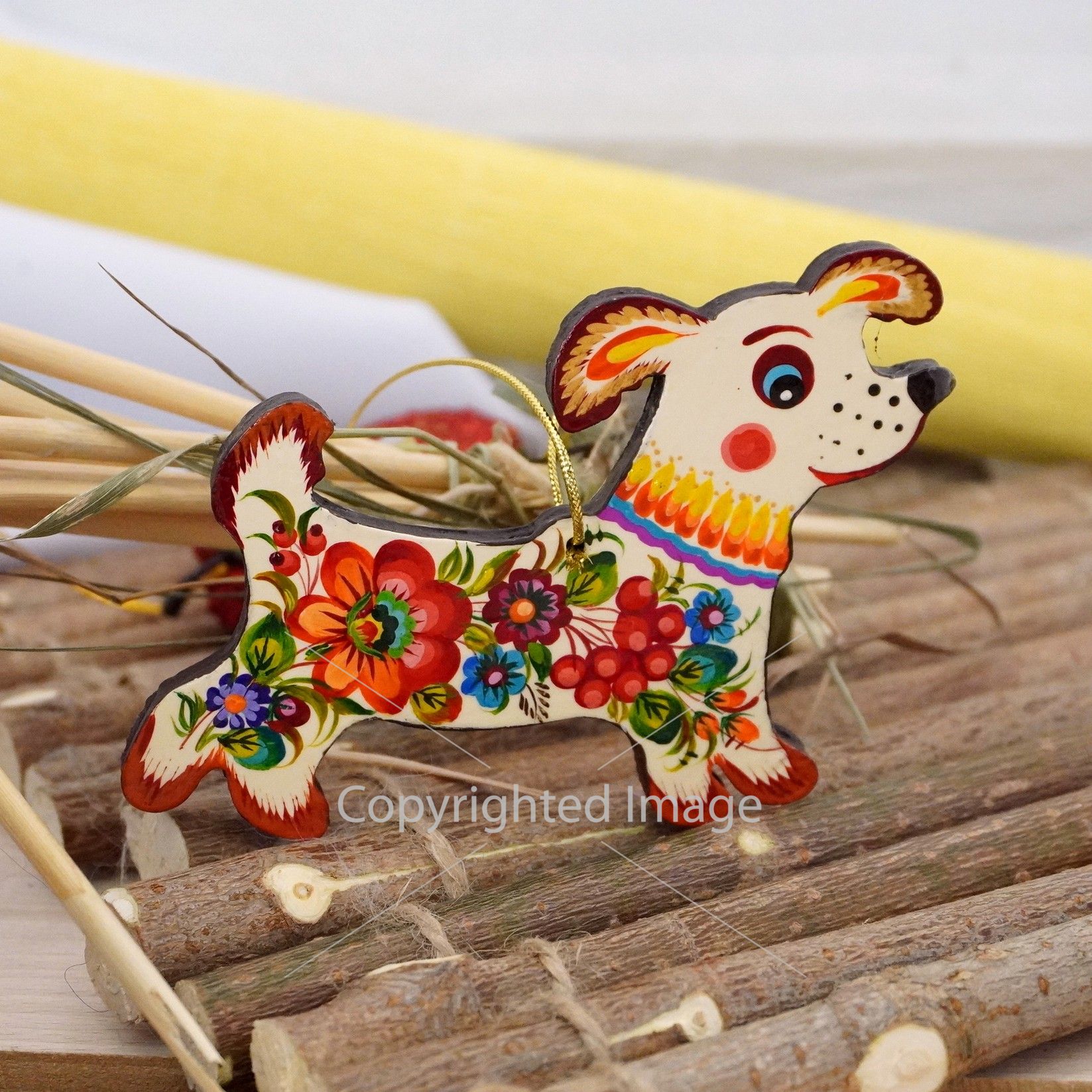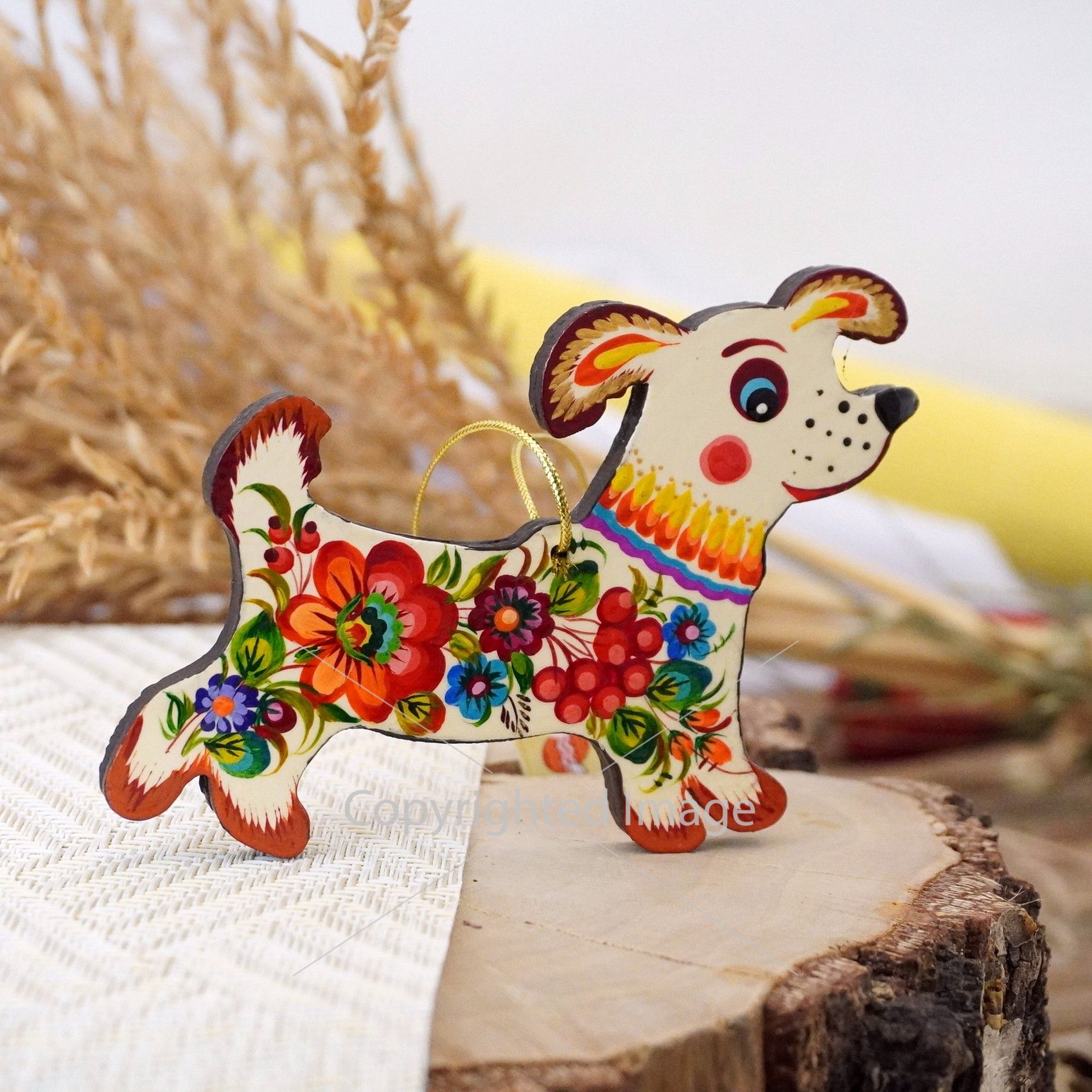 Елочная игрушка с Петриковской росписью "Собачка", цветы на светлом