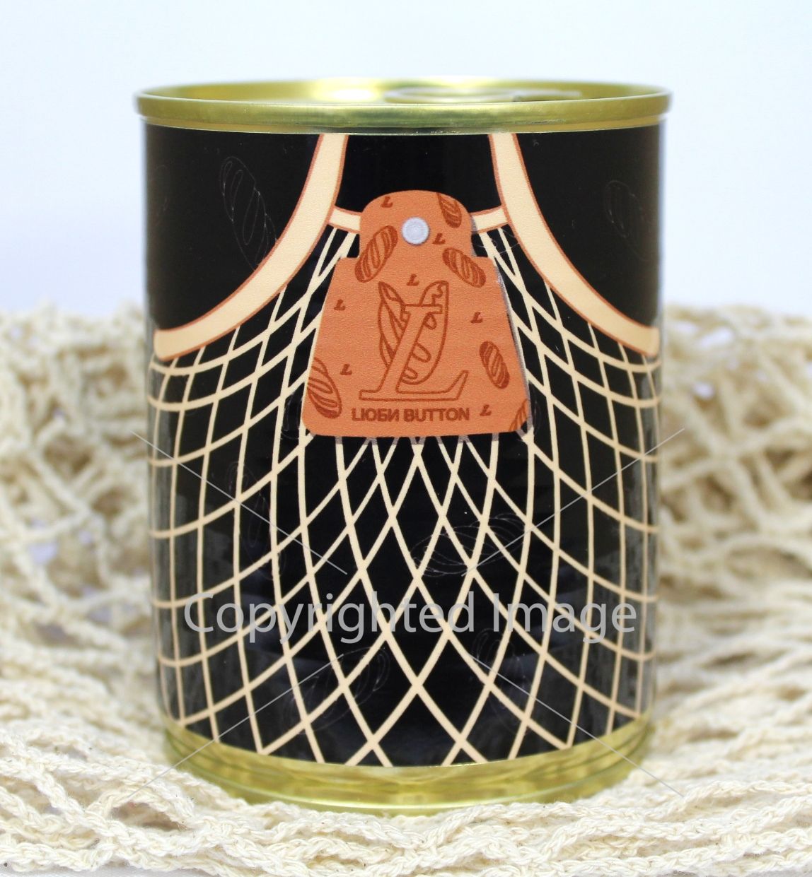 - Эко-сумку или авоську LЮБИ BUTTON мы запаковали, точнее закатали в консервную банку.