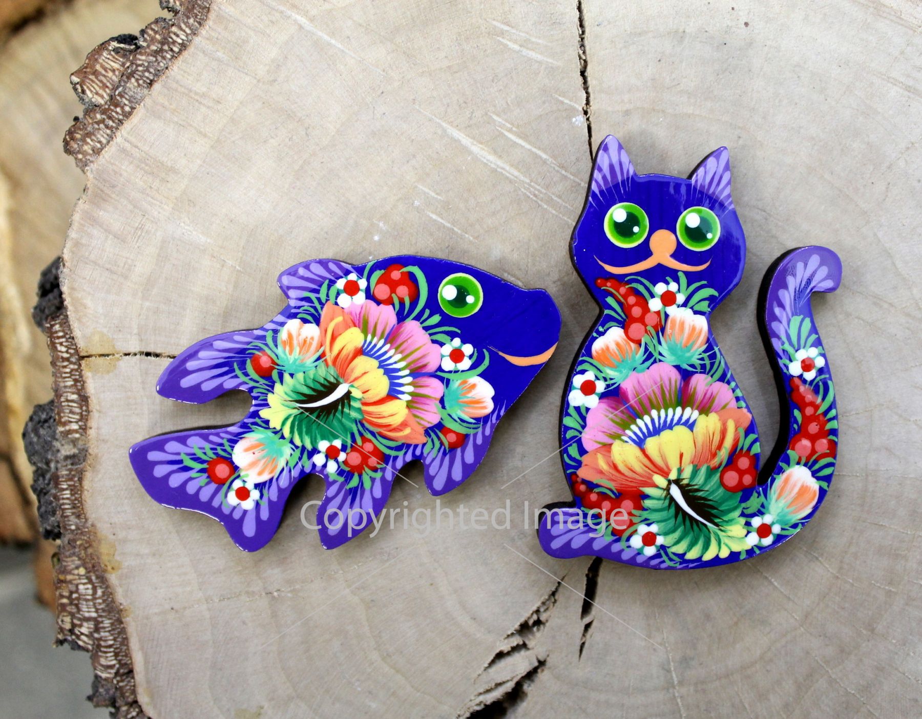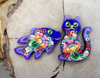 Магниты на холодильник с Петриковской росписью "Рыбка и кот"