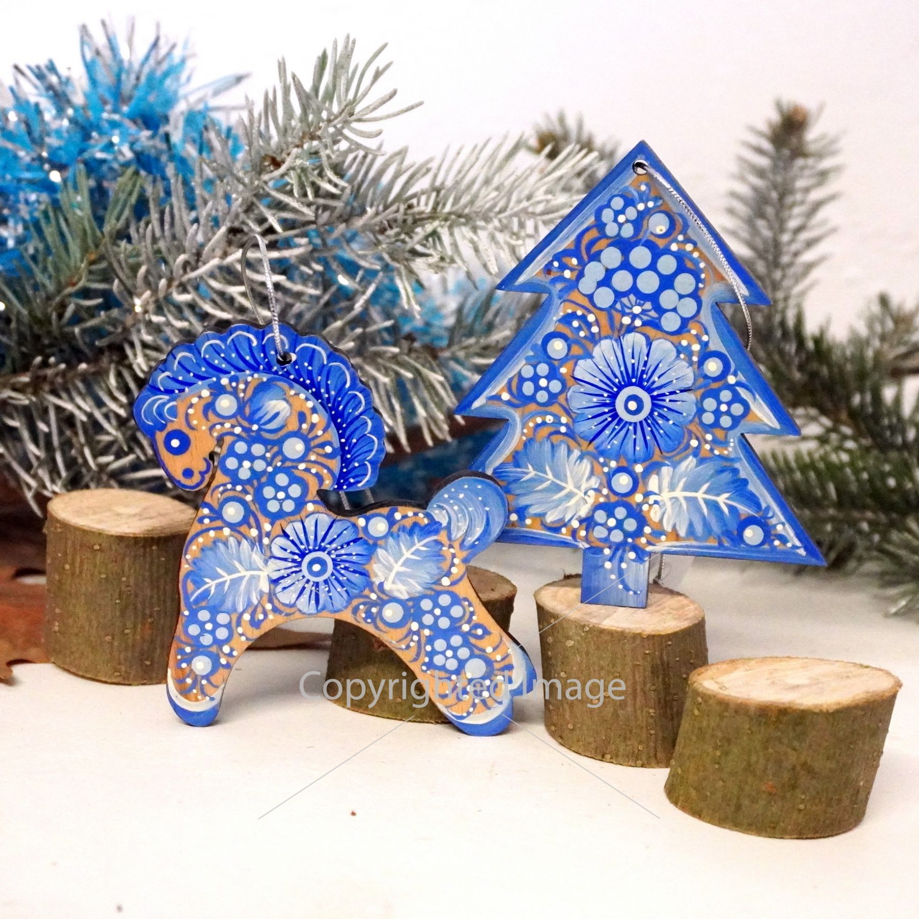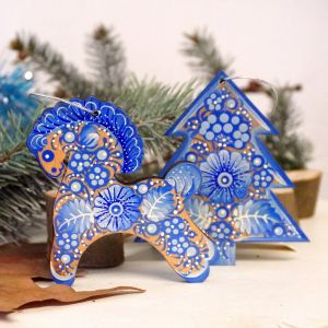 Набор елочных игрушек с Петриковской росписью " Елочка и лошадка" в голубых тонах