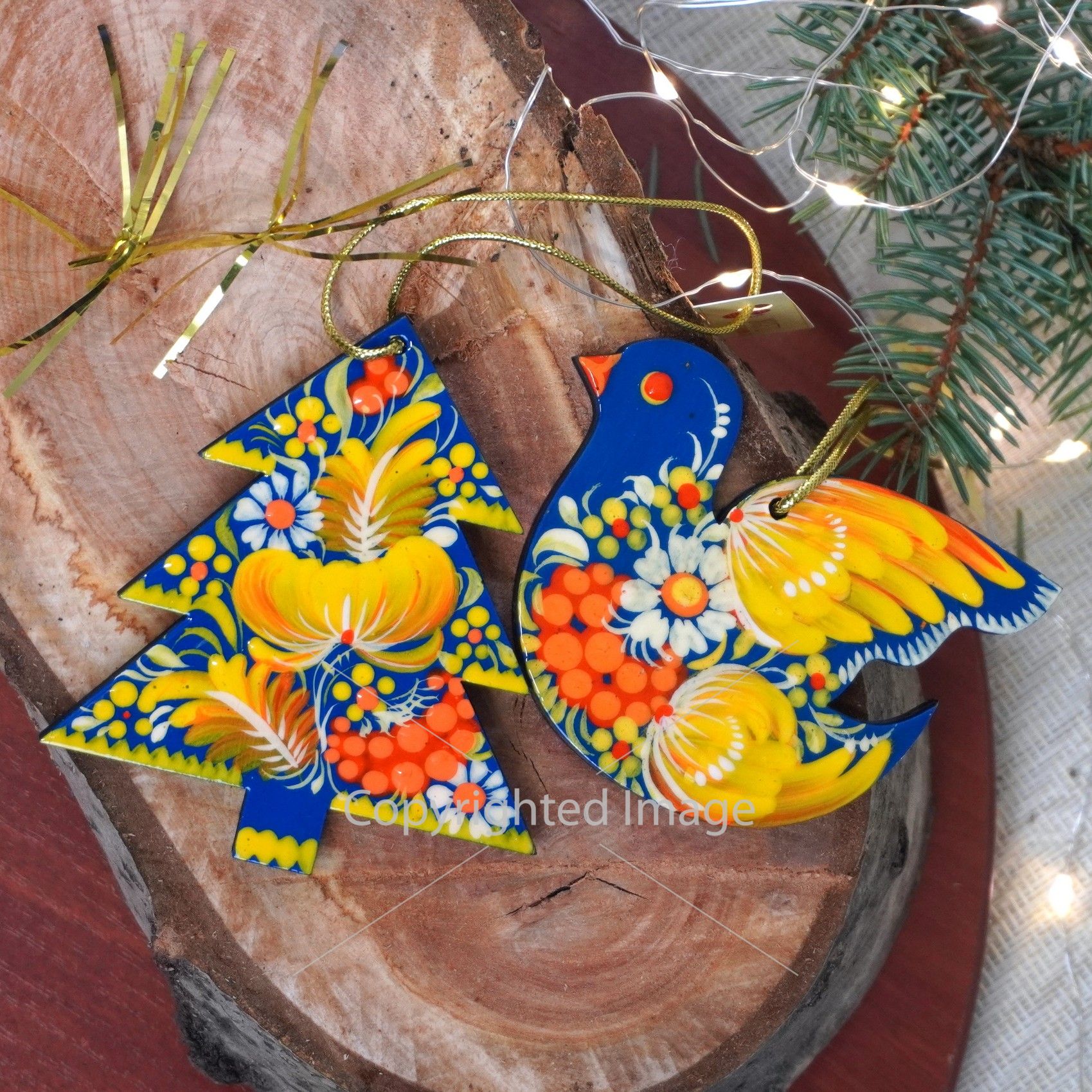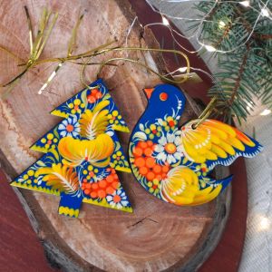 Набор елочных игрушек с Петриковской росписью " Елочка и пташка" желто-синий