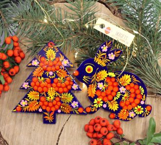 Набор елочных игрушек с Петриковской росписью "Елочка и зайчик"