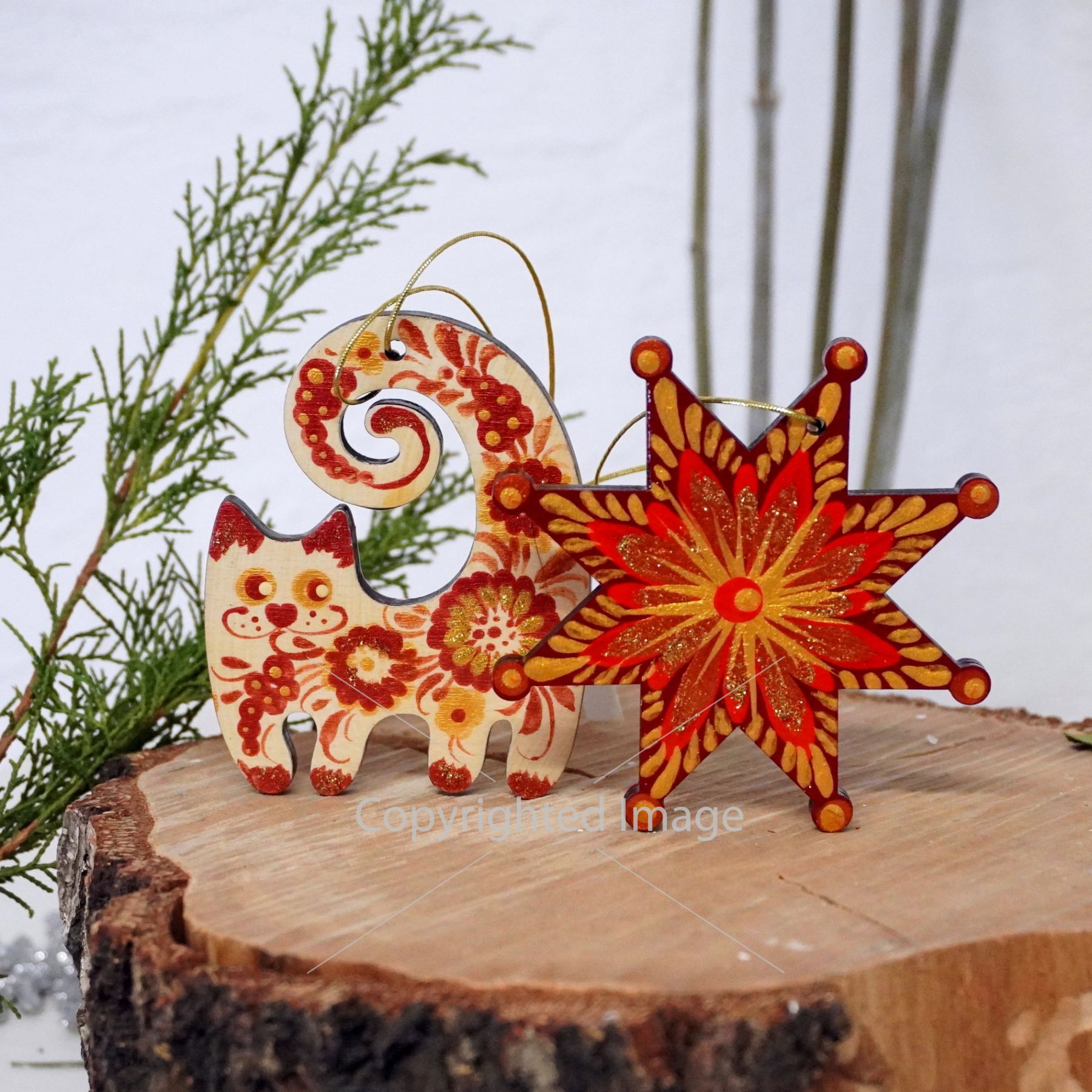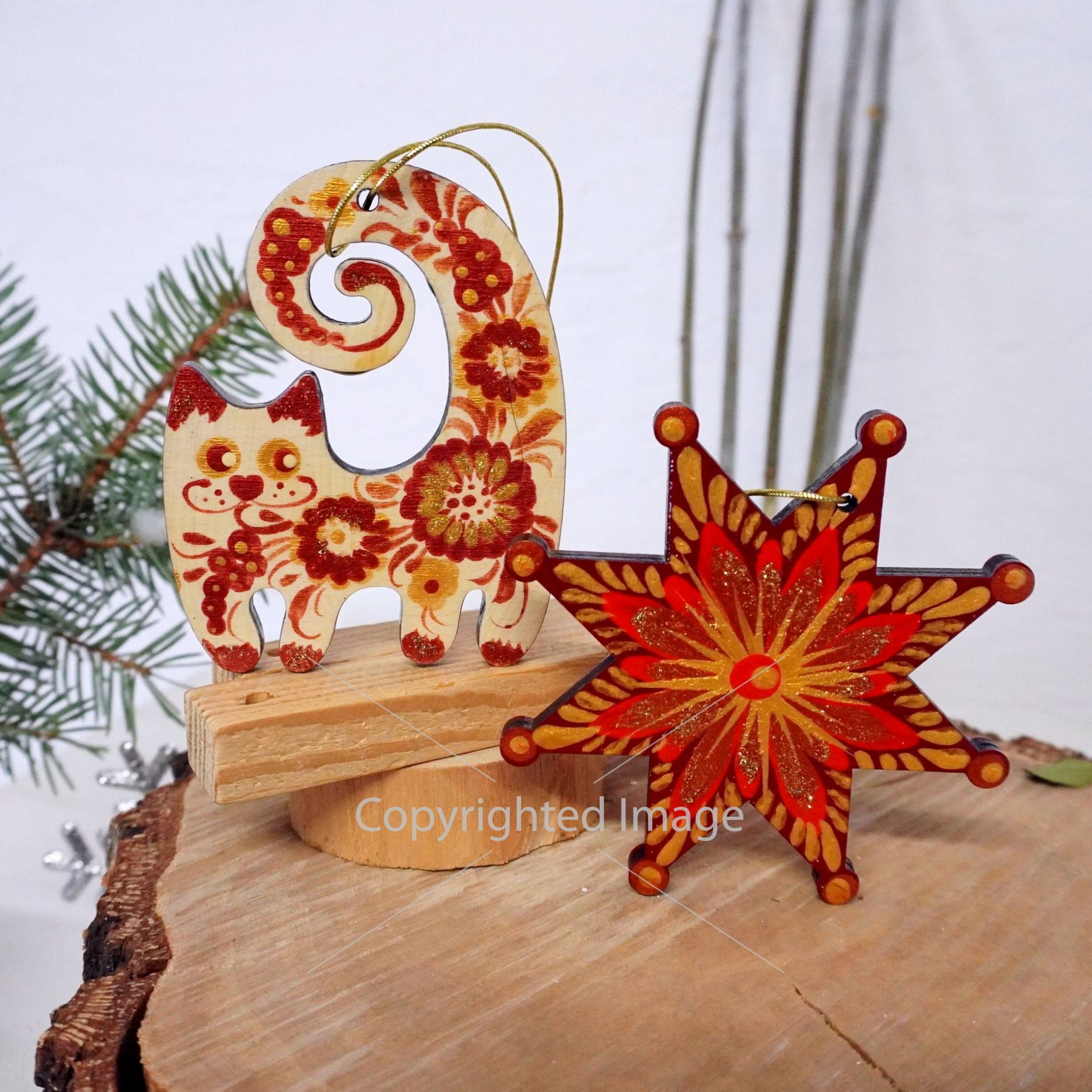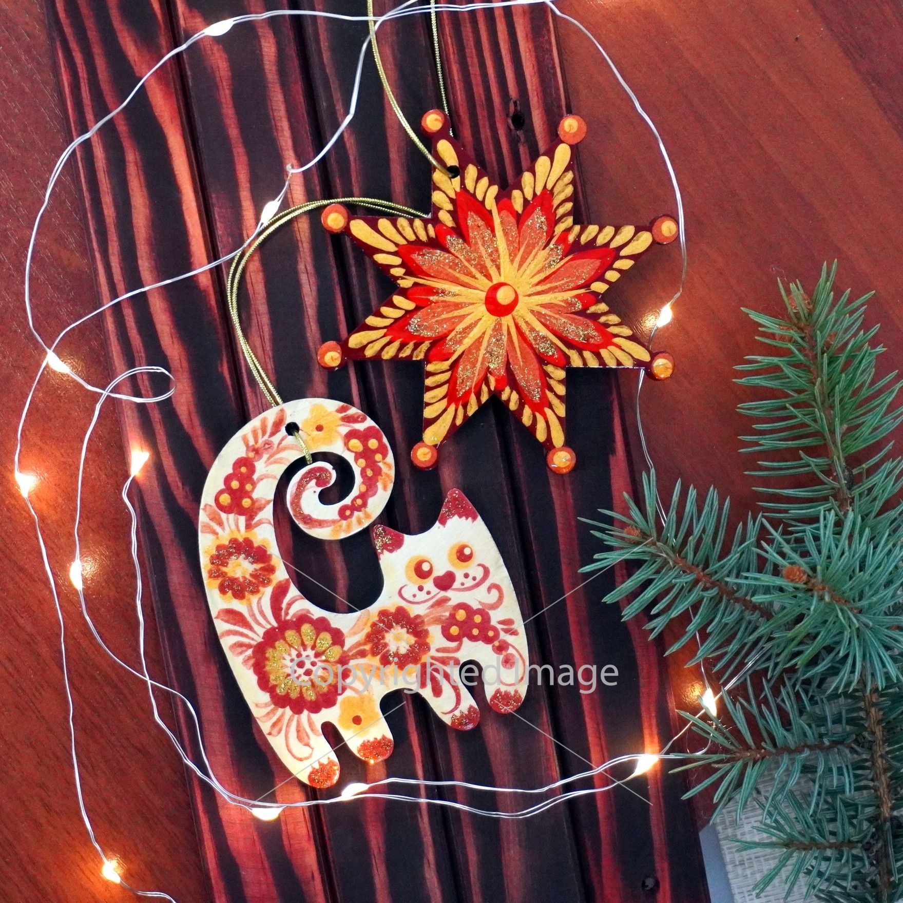 Набор елочных игрушек с Петриковской росписью "Котик и звездочка" искрящий
