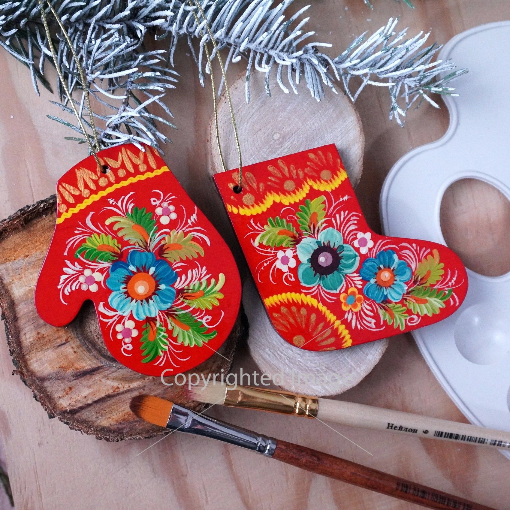 Набор елочных игрушек с Петриковской росписью "Варежка и сапожок" на красном