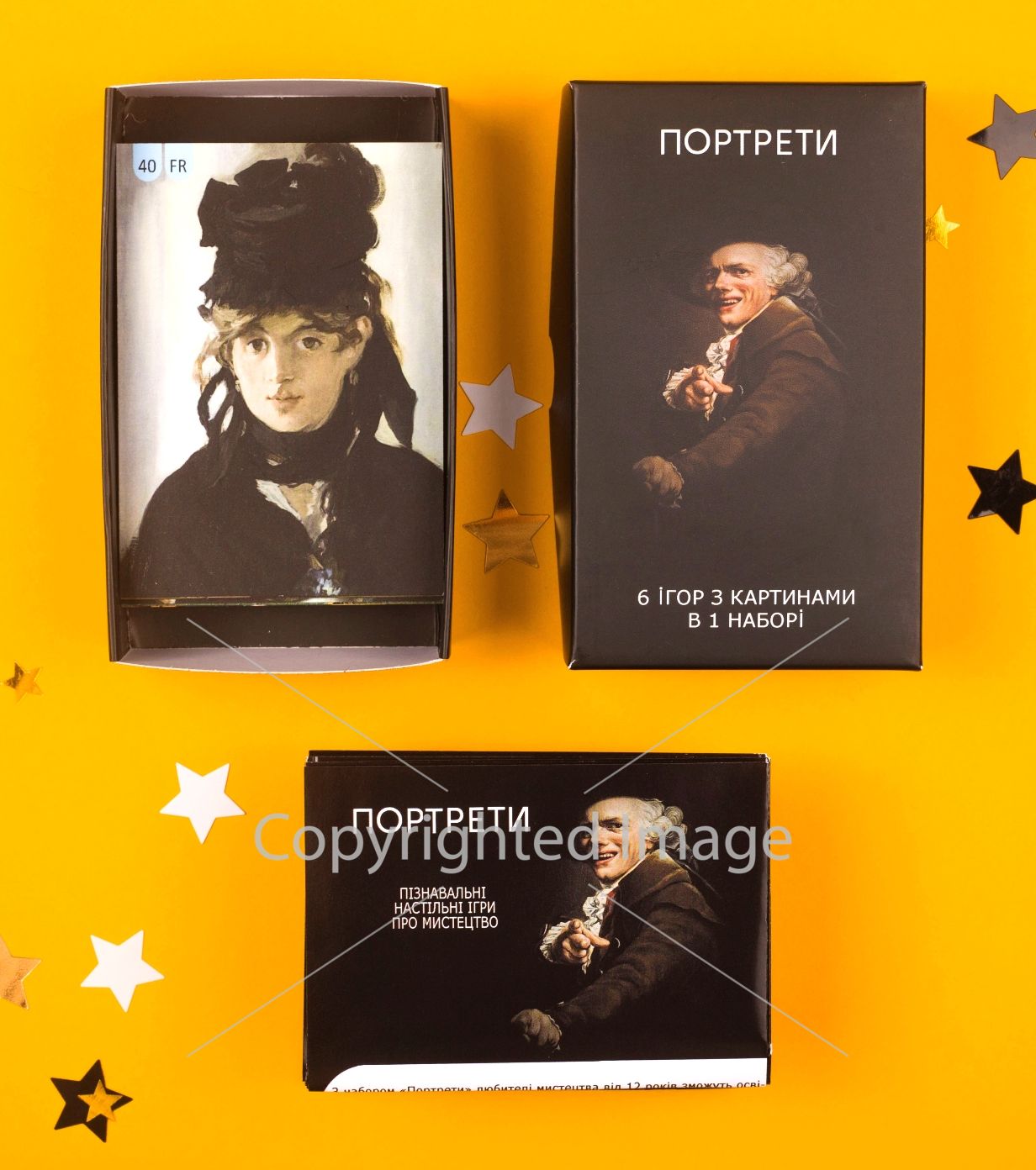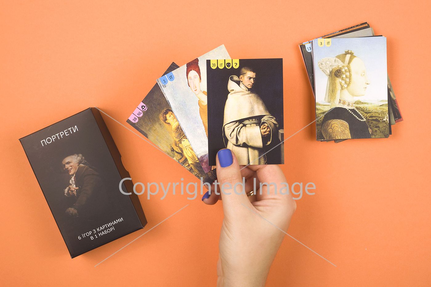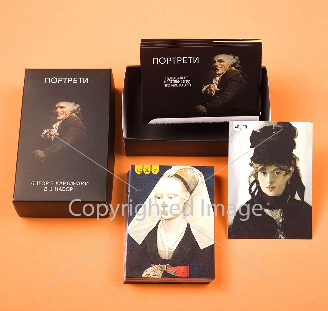 В ваших руках картинные галереи мира. Портреты, собранные со времен эпохи Возрождения и вплоть до художников наших дней. 40 картин, с помощью которых Вы сможете сыграть в 6 увлекательных игр. Ну и конечно же, играючи, проследить как развивался и видоизменялся этот жанр на протяжении 500 лет. К набору портретов Вам потребуется: внимание, сосредоточенность, память, зоркий глаз и стратегические навыки. А азарт и удовольствие от игры, мы Вам гарантируем.