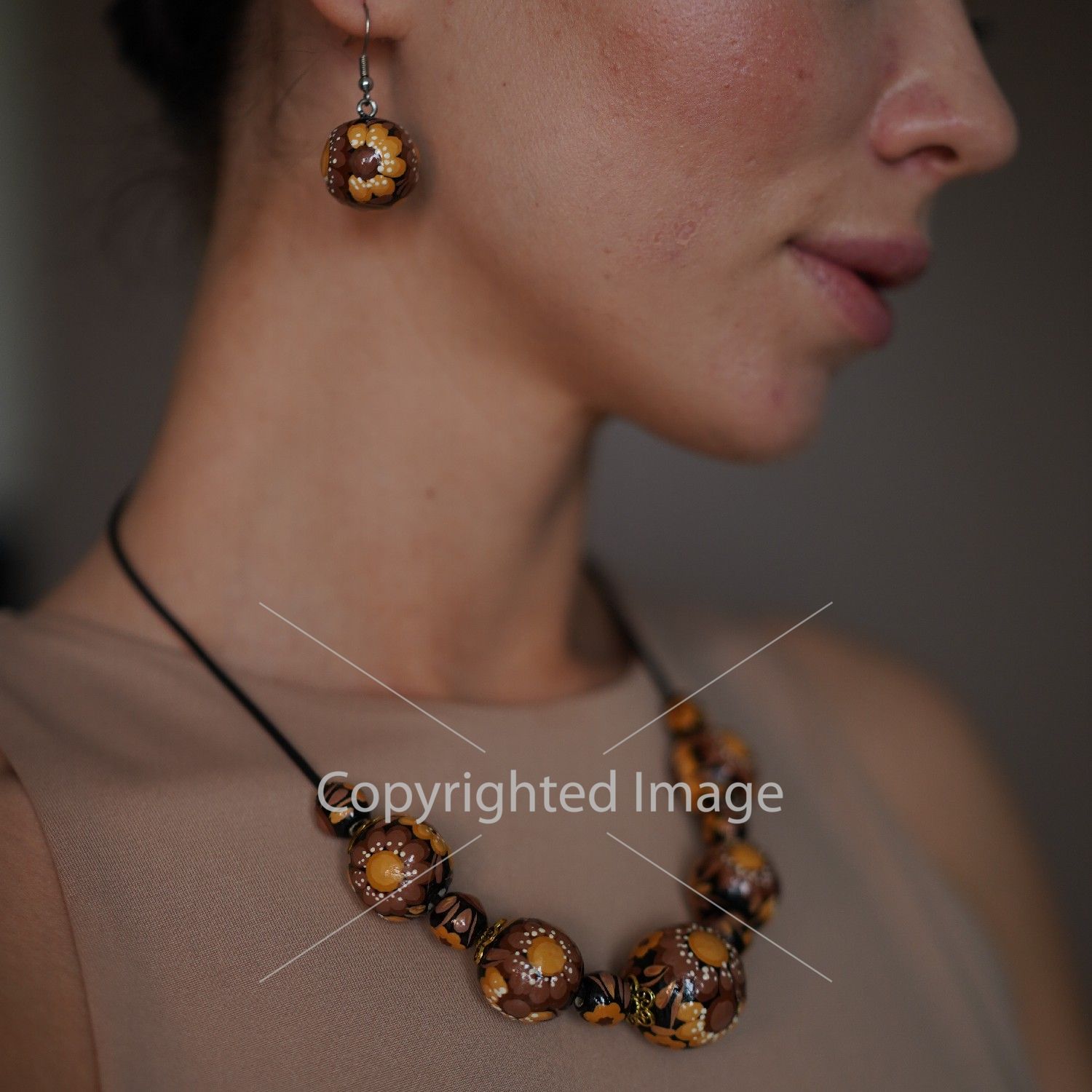 - Расписанные вручную деревянные бусины с нежными петриковскими цветочными узорами.