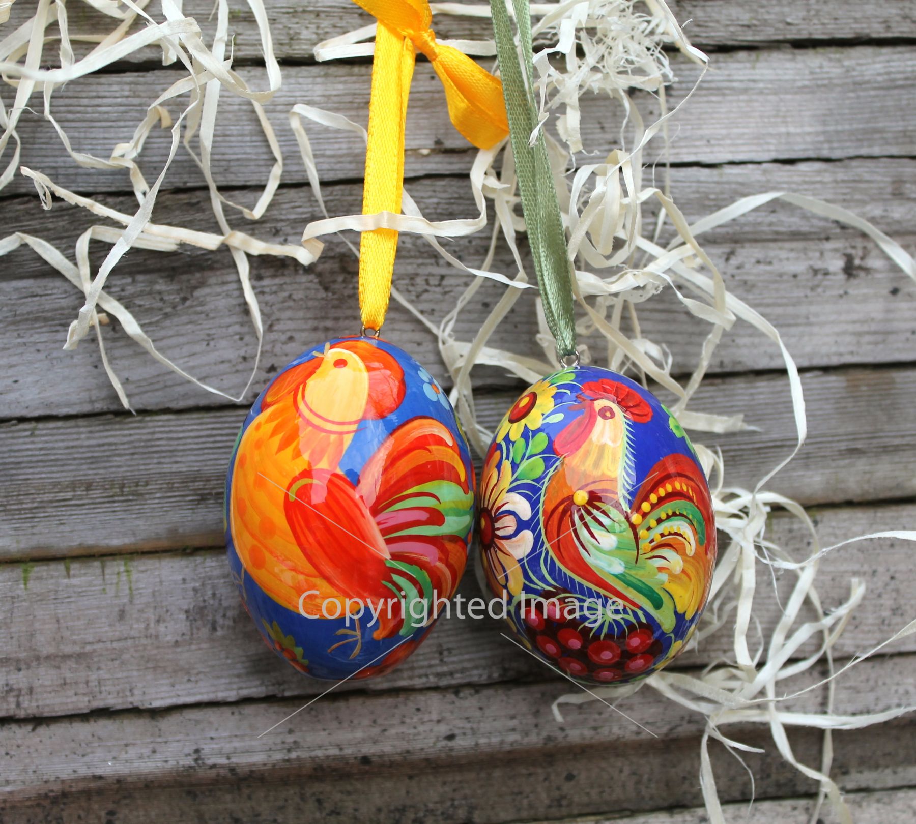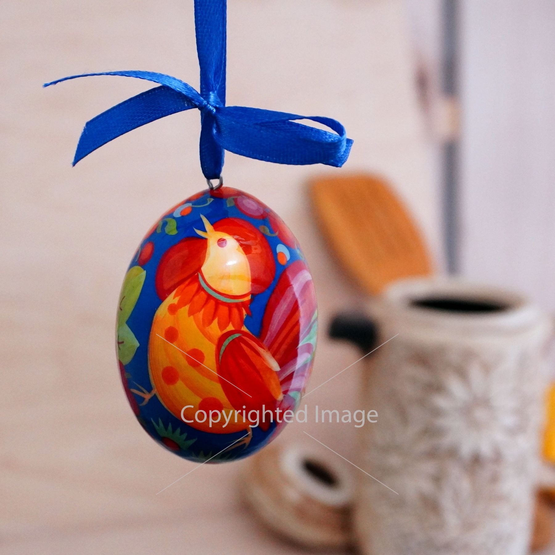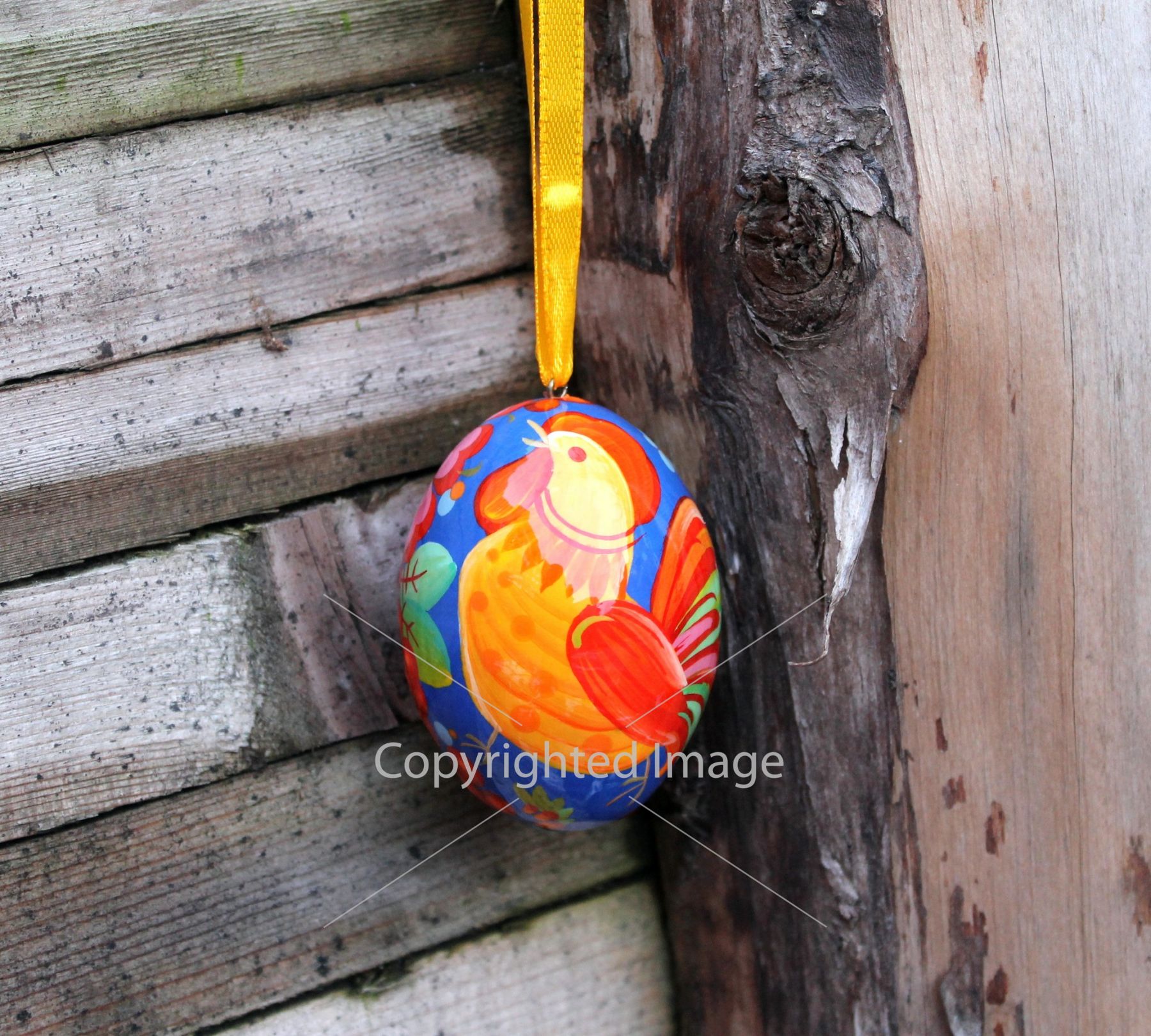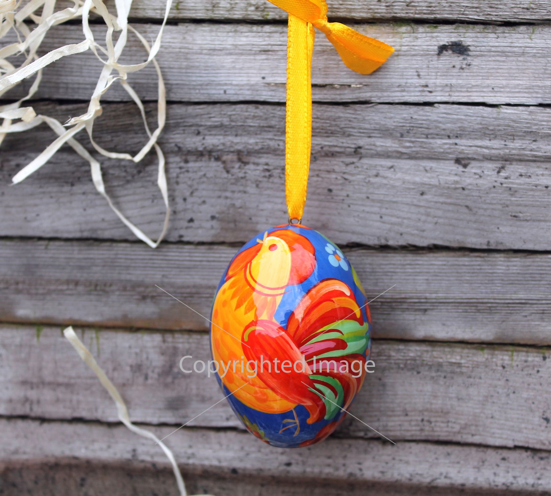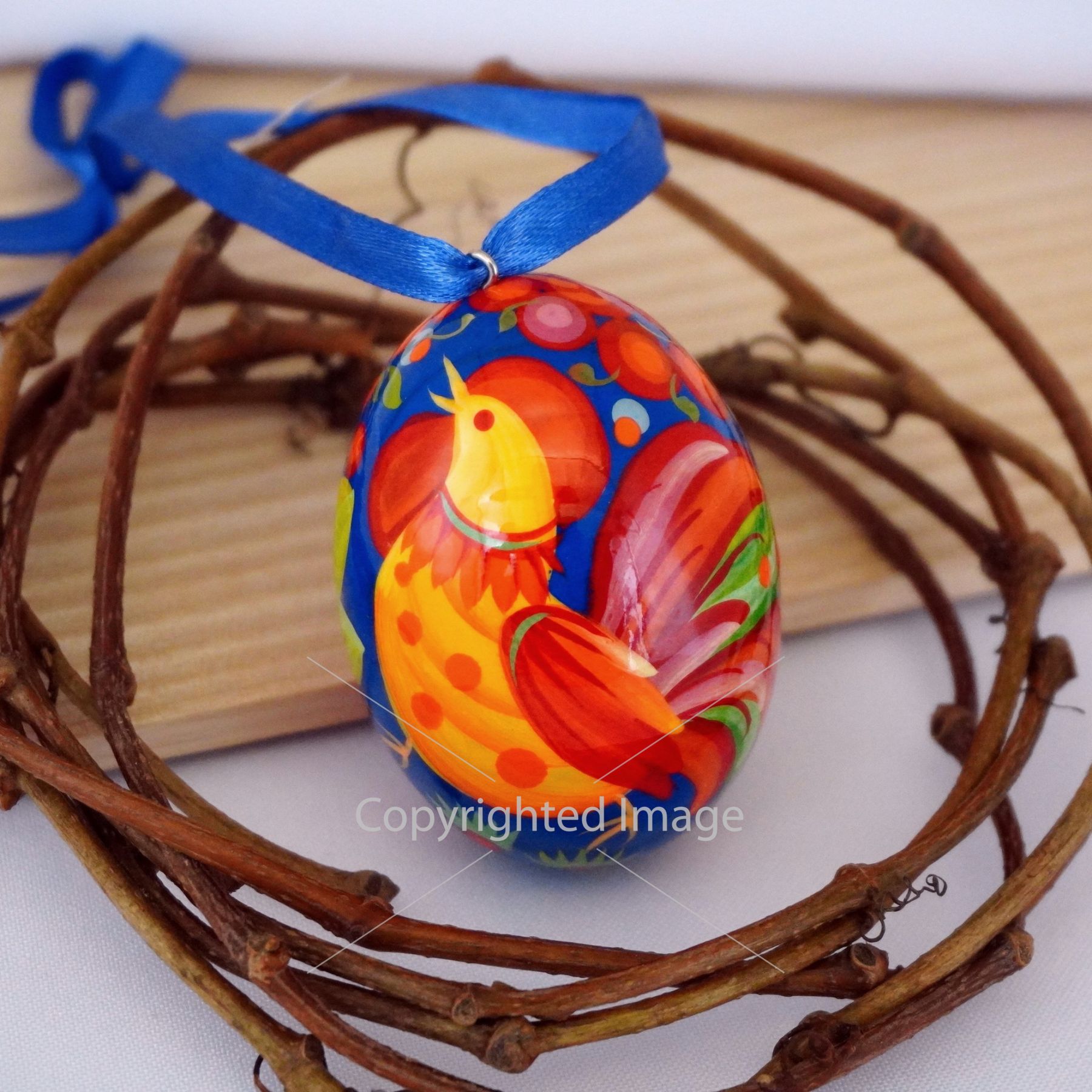 Деревянное пасхальное яйцо с Петриковской росписью "Петушок" на синем