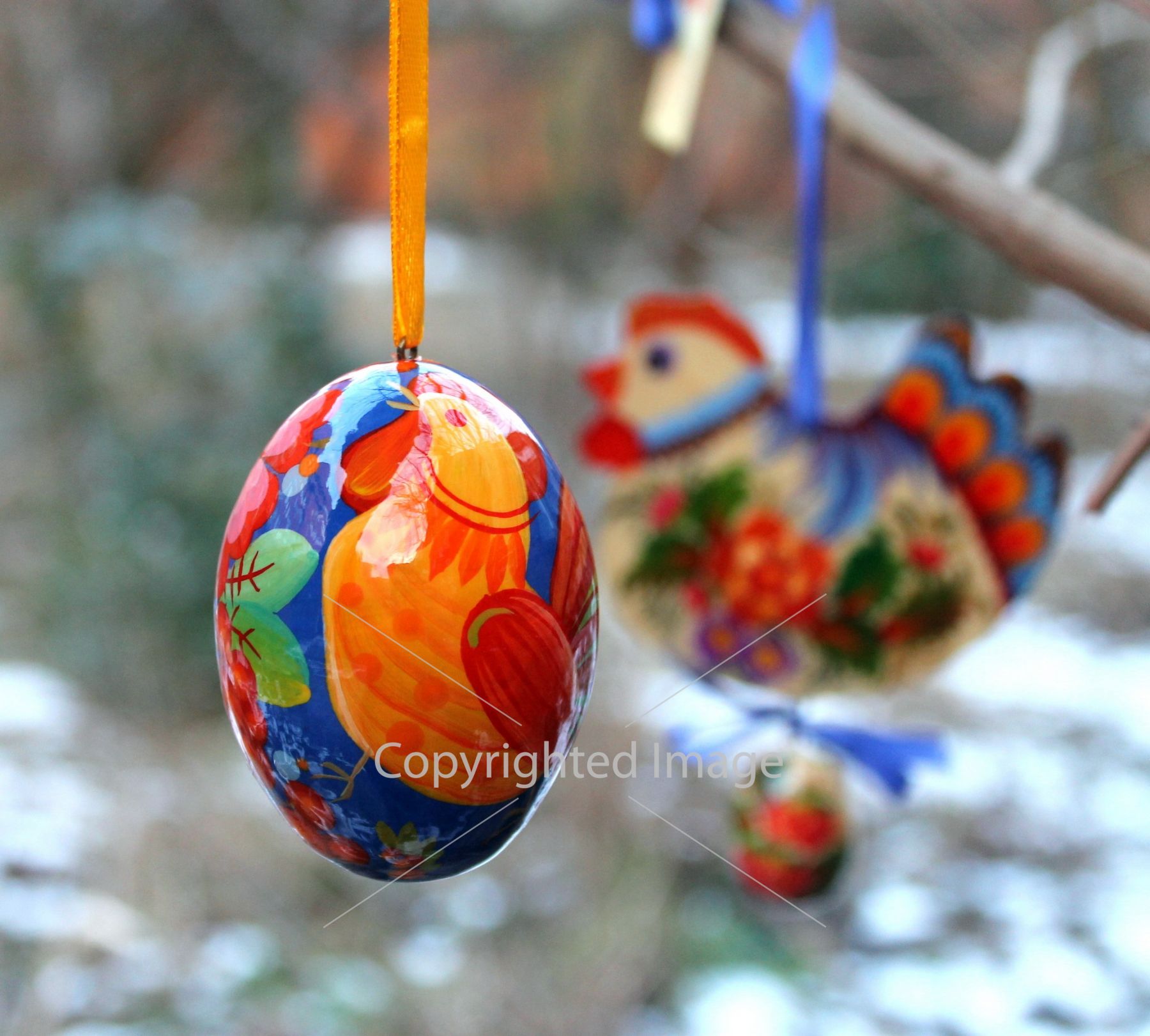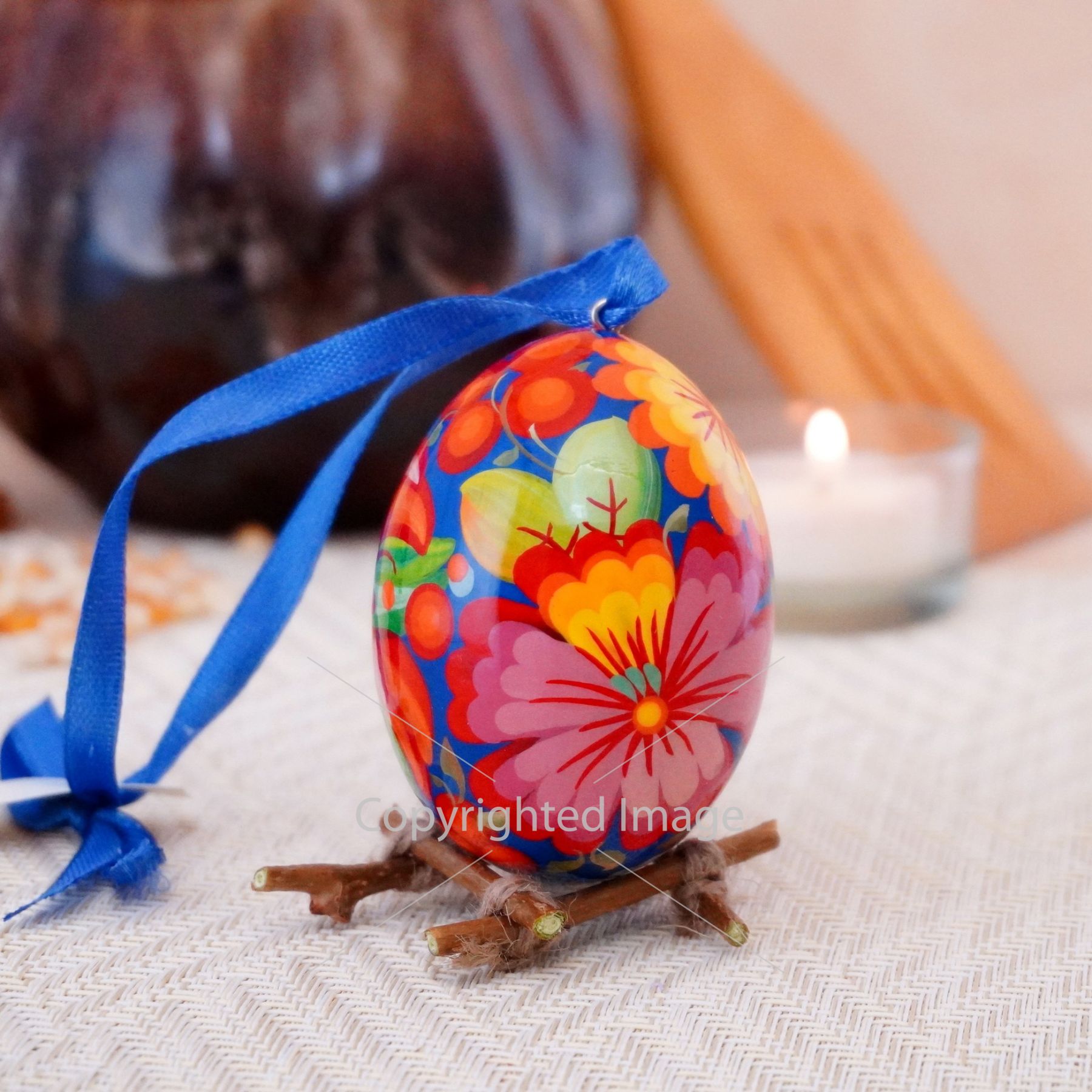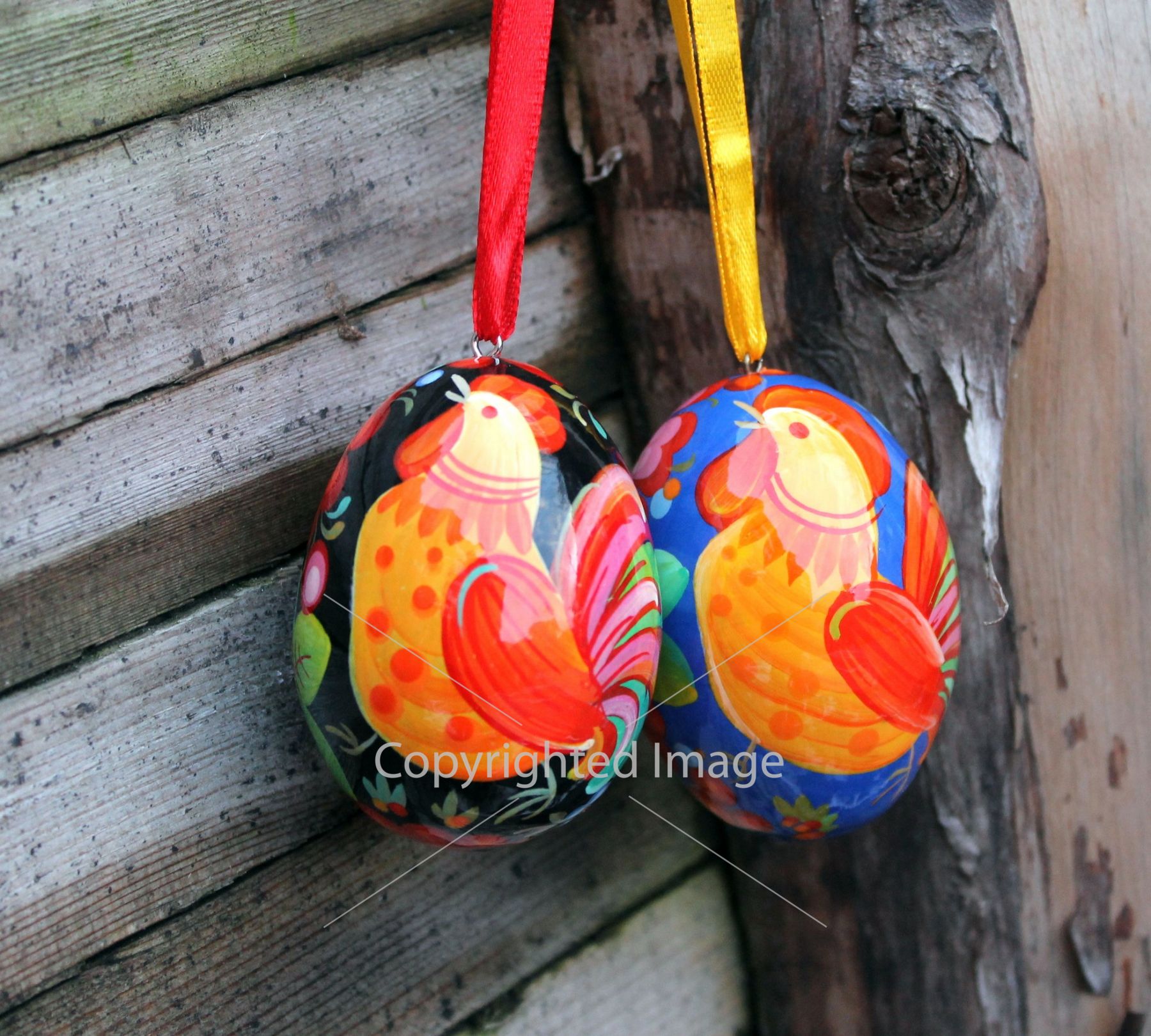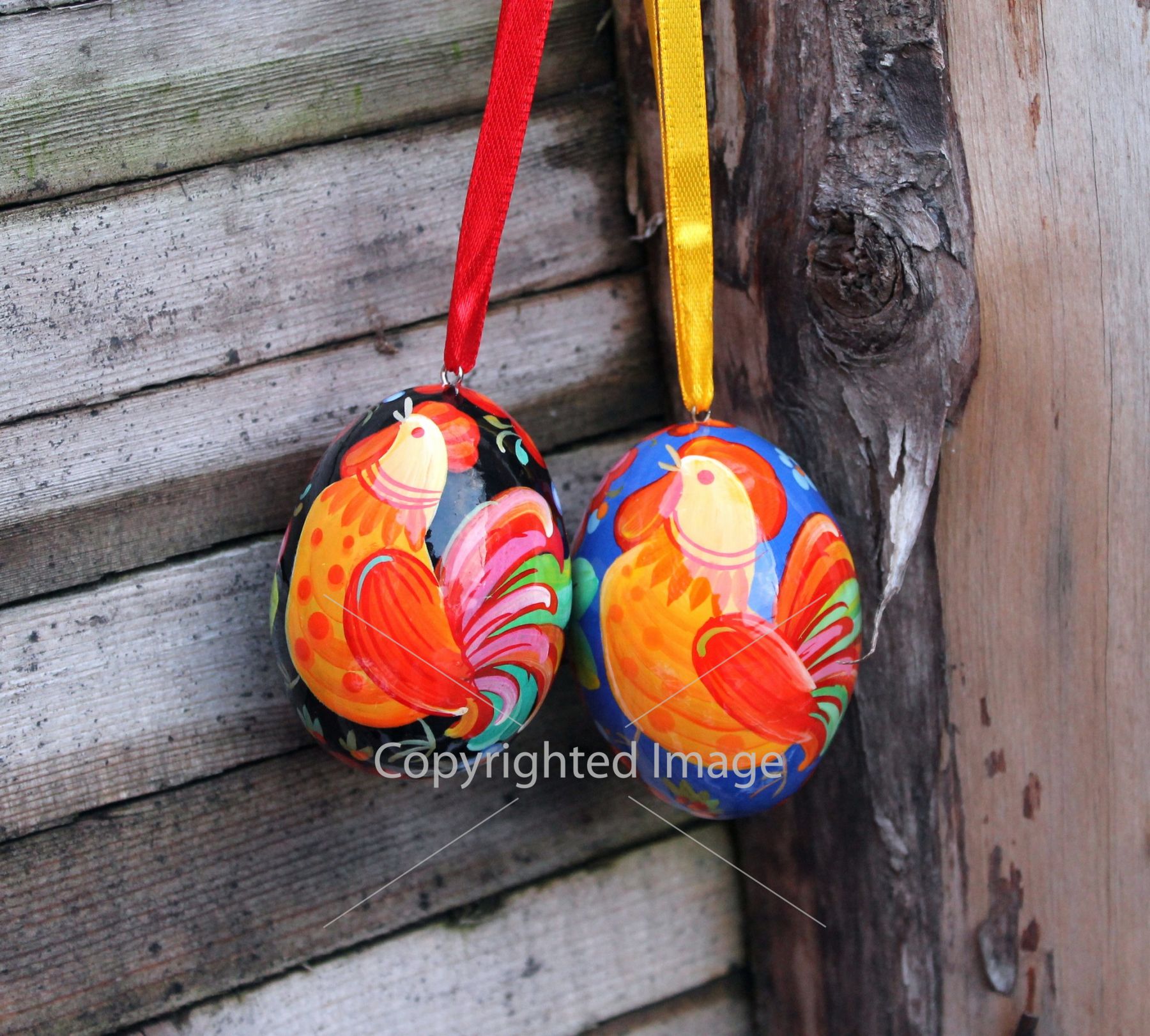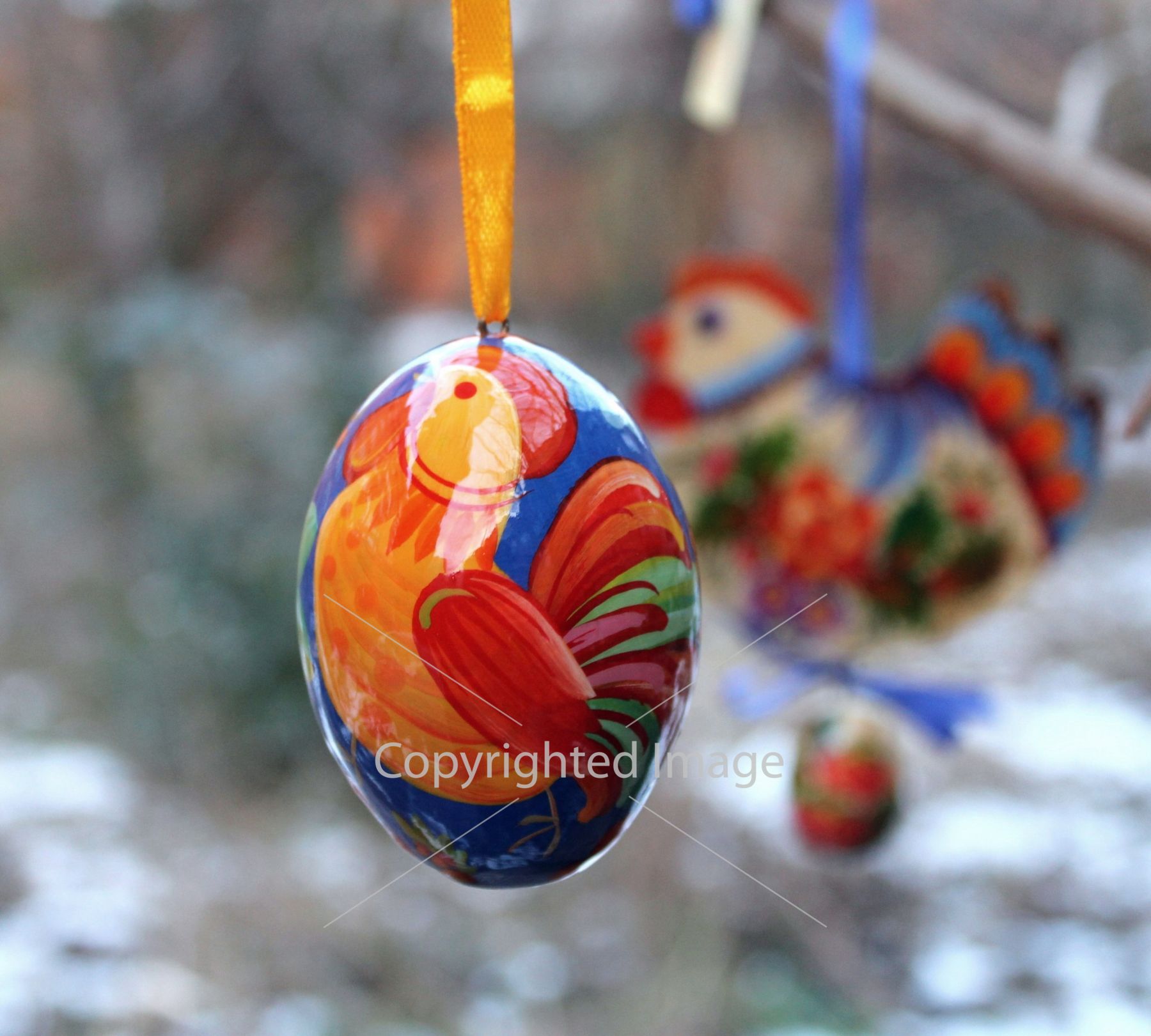 Деревянное пасхальное яйцо с Петриковской росписью "Петушок" на синем