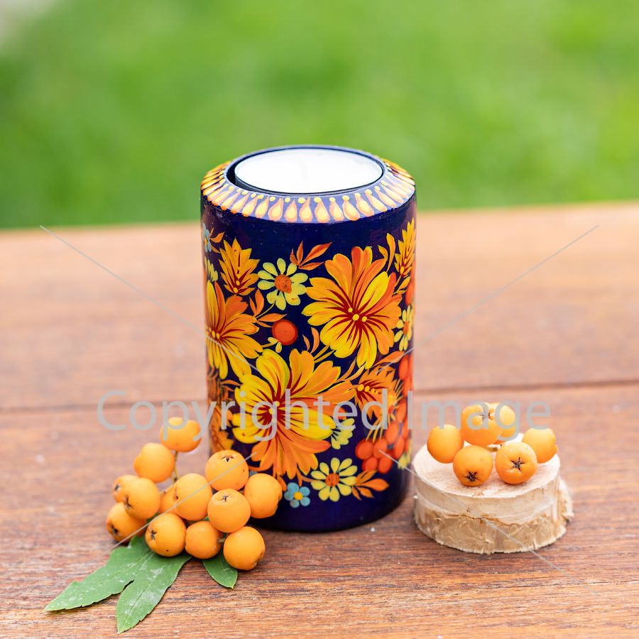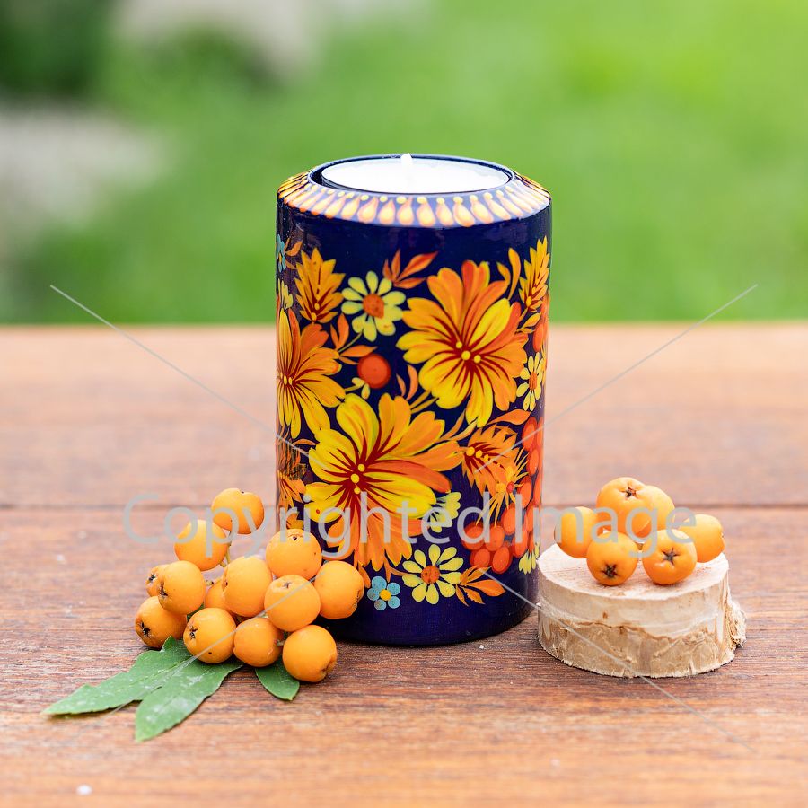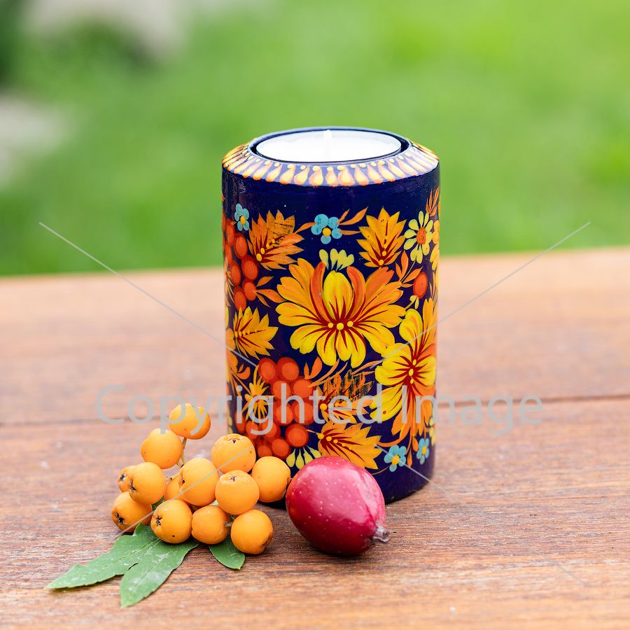 Подсвечник деревянный "Цилиндр". Петриковская роспись (06)