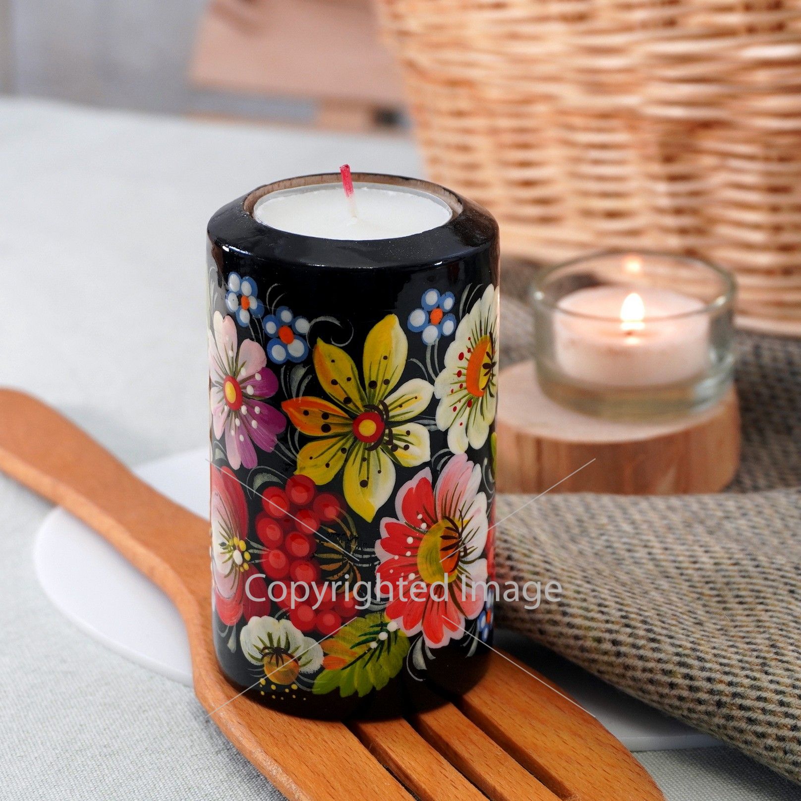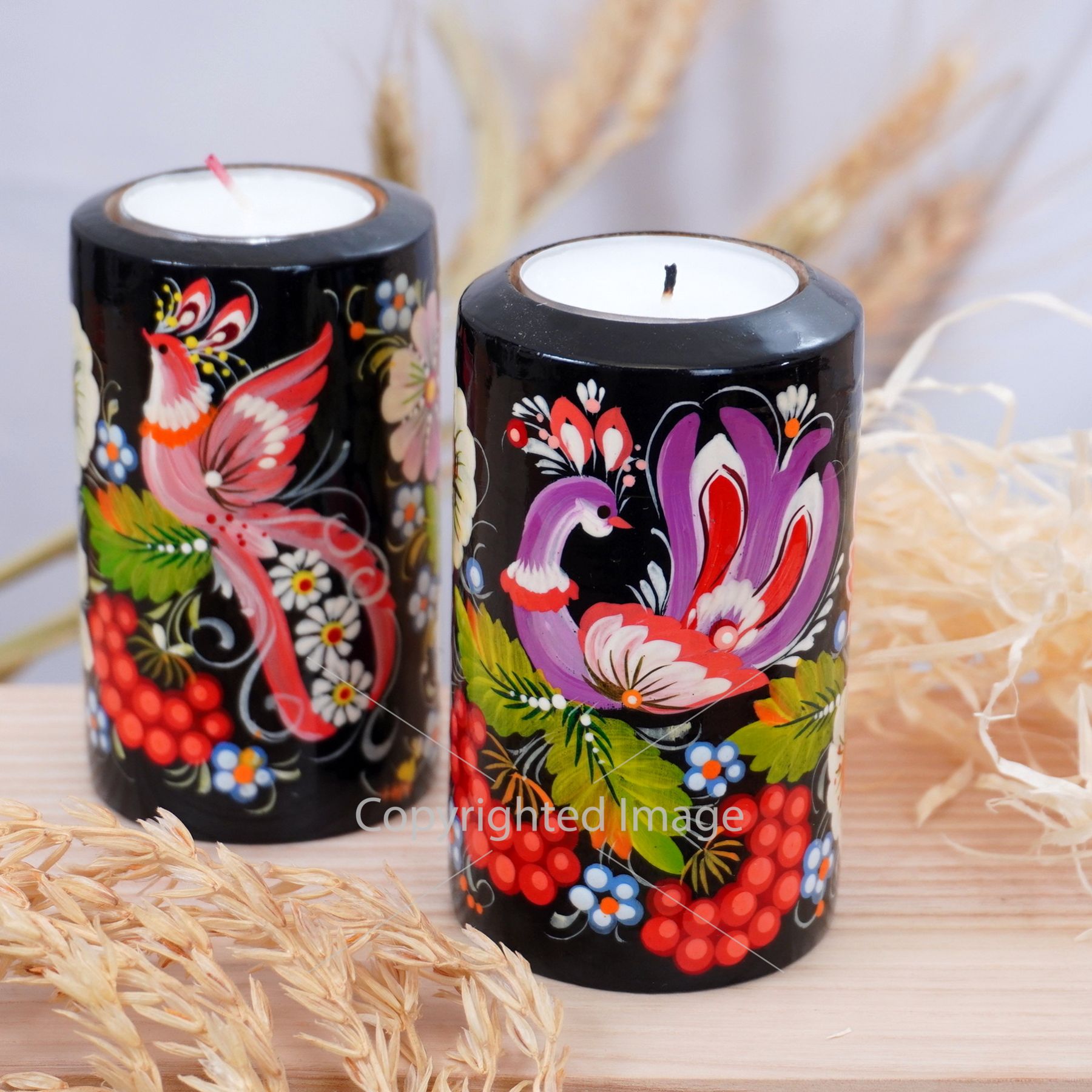 Подсвечник деревянный "Цилиндр" Птица в цветах . Петриковская роспись