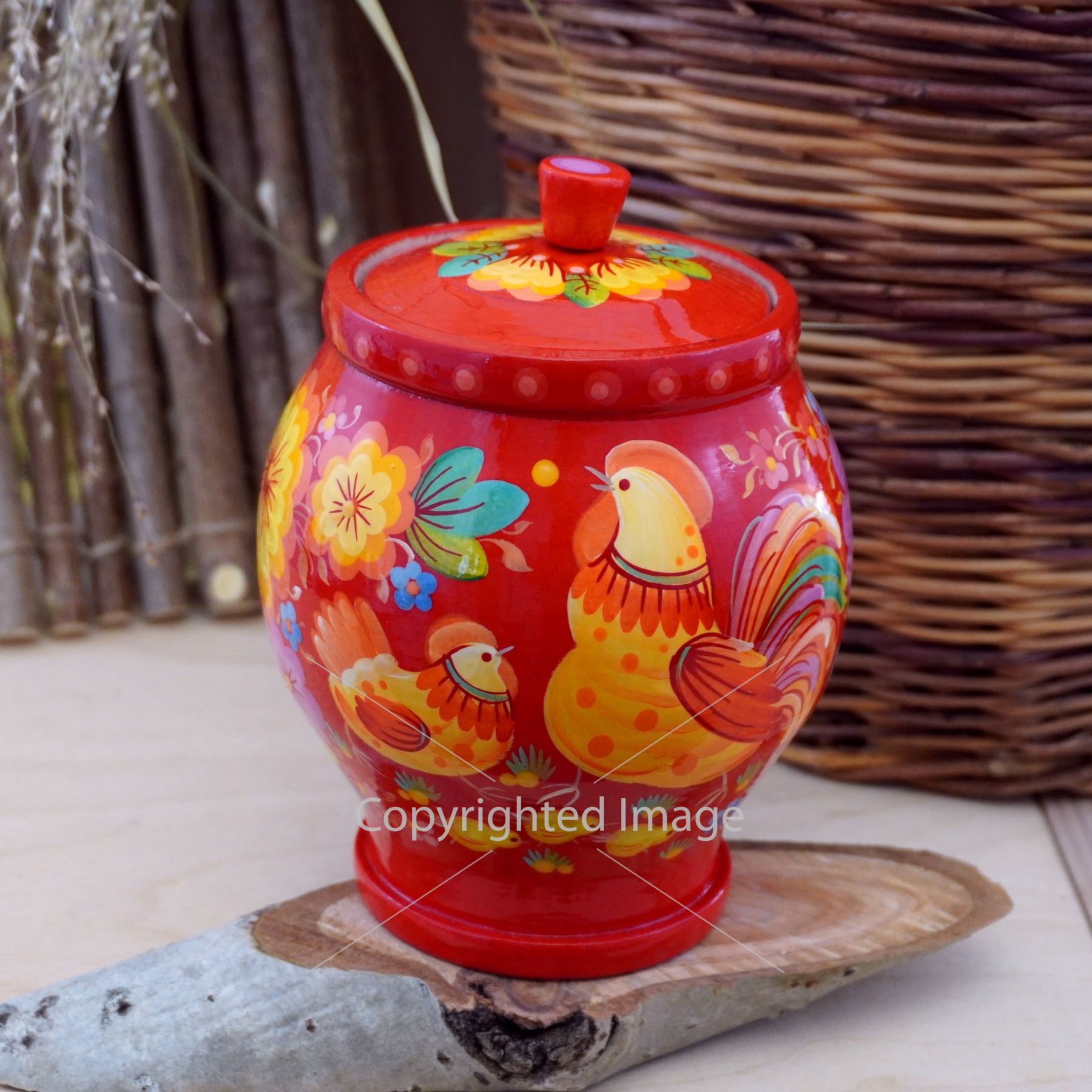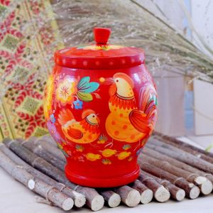 Сахарница, емкость для сыпучих с Петриковской росписью "Петушок" на красном