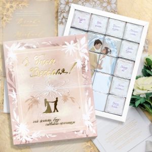 Хотите сделать приятный, вкусный и необычный подарок другу или коллеге на День рождения или другой праздник? Такой, чтоб не только понравился, но и запомнился? Предлагаем приобрести шоколадный набор "З Днем Весілля". Его оригинальность заключается в том, что каждый кусочек в этом наборе завернут в отдельную обертку с замечательными посланиями. Беря очередной кусочек в руки, молодожены обязательно вдохновятся новым жизнеутверждающим пожеланием! В центре располагается трогательная картинка новобрачных. Дарите весёлые, креативные подарки и люди поймут, что они сделаны от всего сердца!