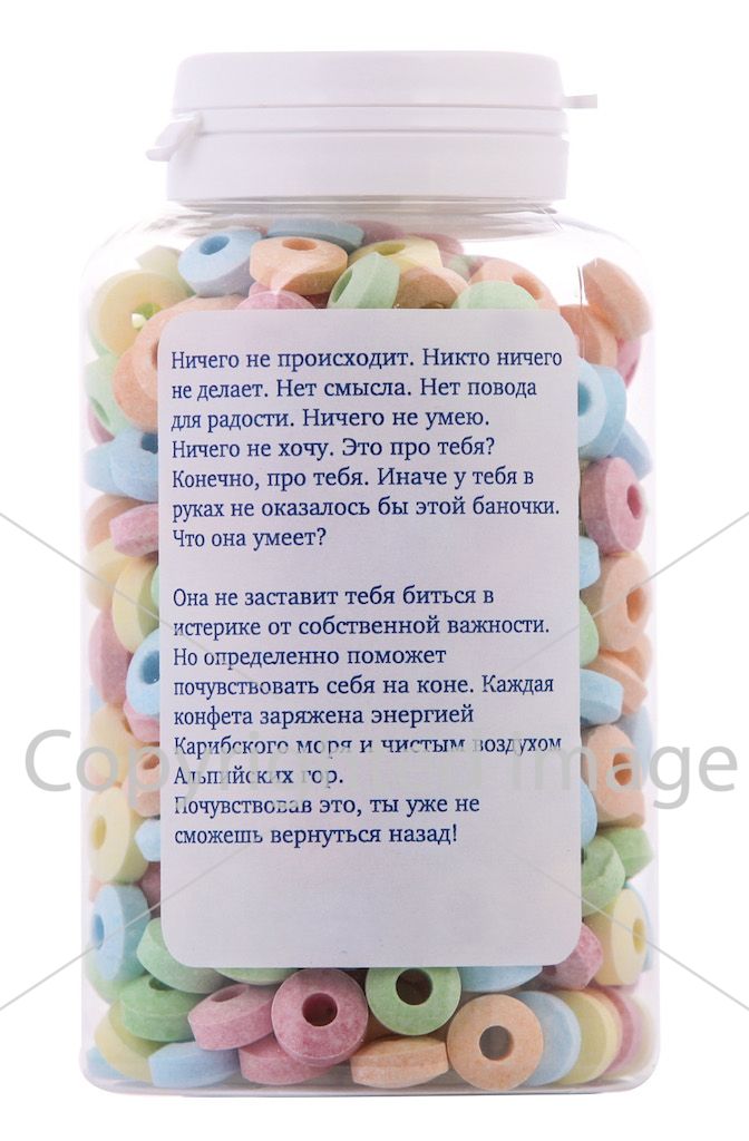 Вашему вниманию — “сладкая доза” чудодейственного препарата, собранного из глюкозного сиропа, желатина, сахара, натуральных ароматизаторов, растительных масел и натуральных цветовых компонентов, пчелиного и карнаубского воска. Комбинация вышеперечисленных ингредиентов подобрана согласно индивидуальным рецептам, указанным на лицевой стороне препарата. Для достижения максимального положительного эффекта, необходимо придерживаться особых предписаний, размещенных на контрэтикетке. Нет побочных эффектов при передозировке. Не вызывает привыкания. Действие препарата может вызвать сильную заинтересованность и легкое чувство зависти у находящихся поблизости людей.