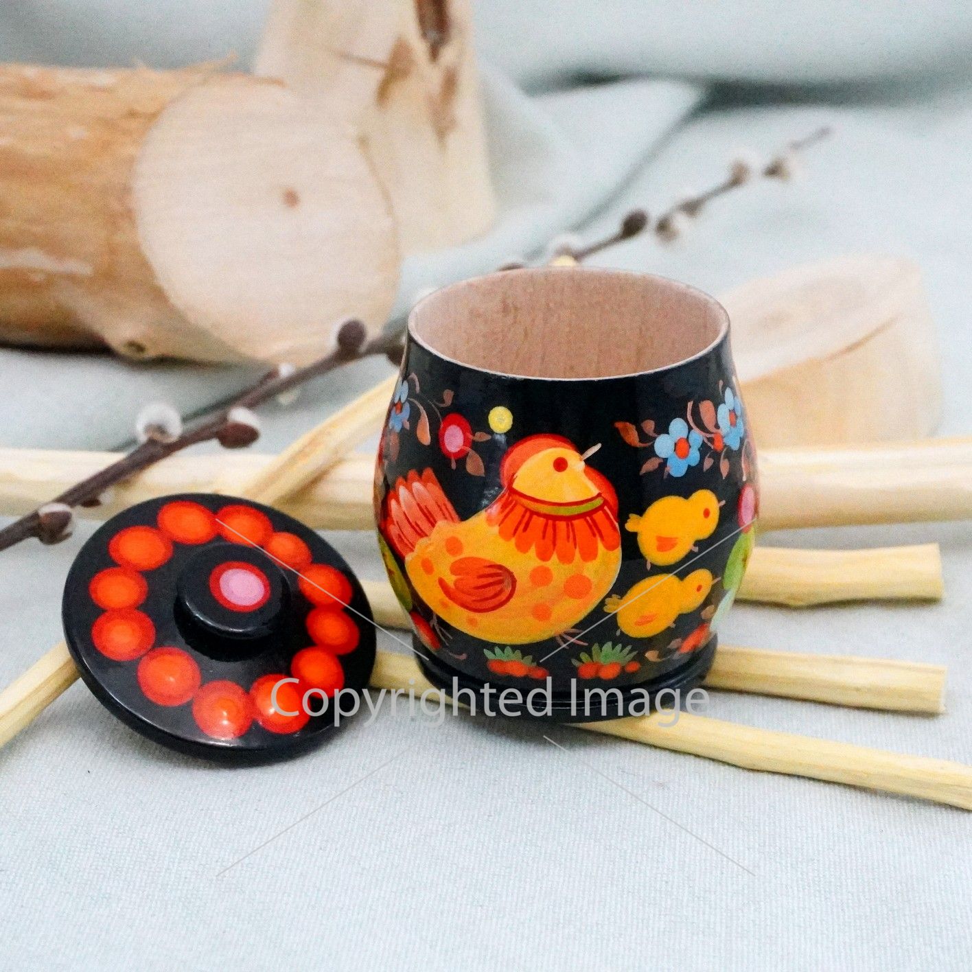 Солонка, емкость для сыпучих с Петриковской росписью "Курочка с цыплятами" на черном