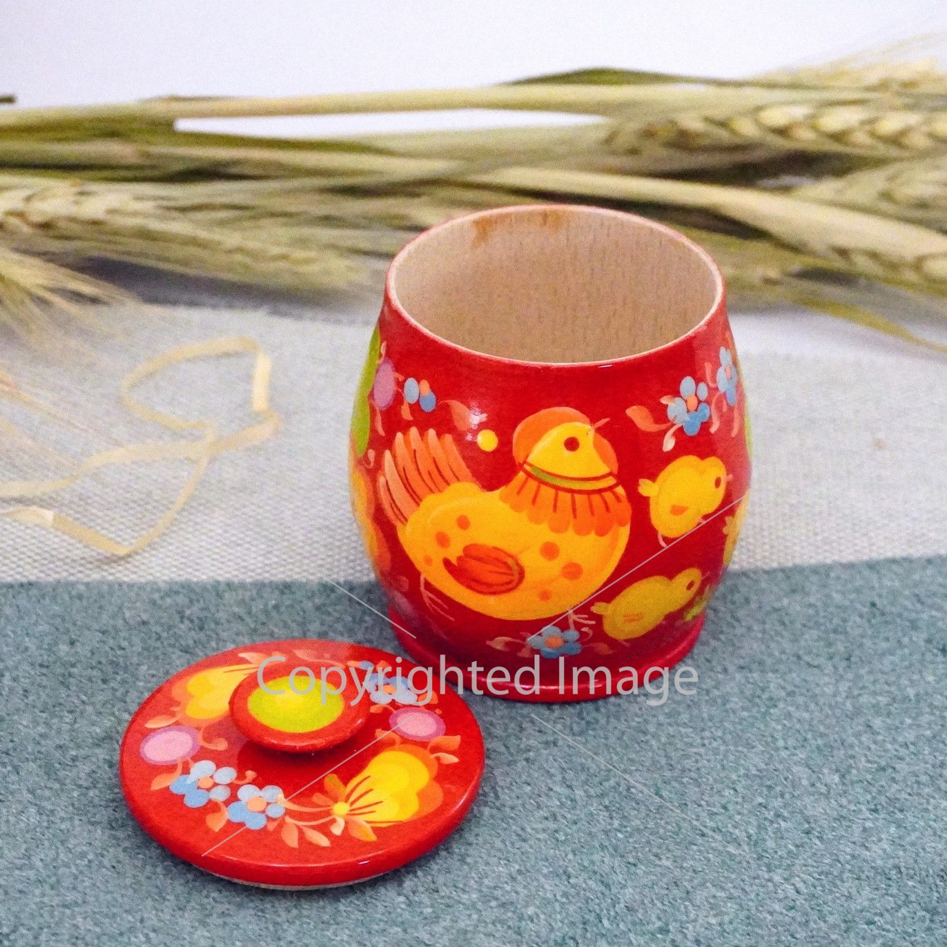 Солонка, емкость для сыпучих с Петриковской росписью "Курочка с цыплятами" на красном