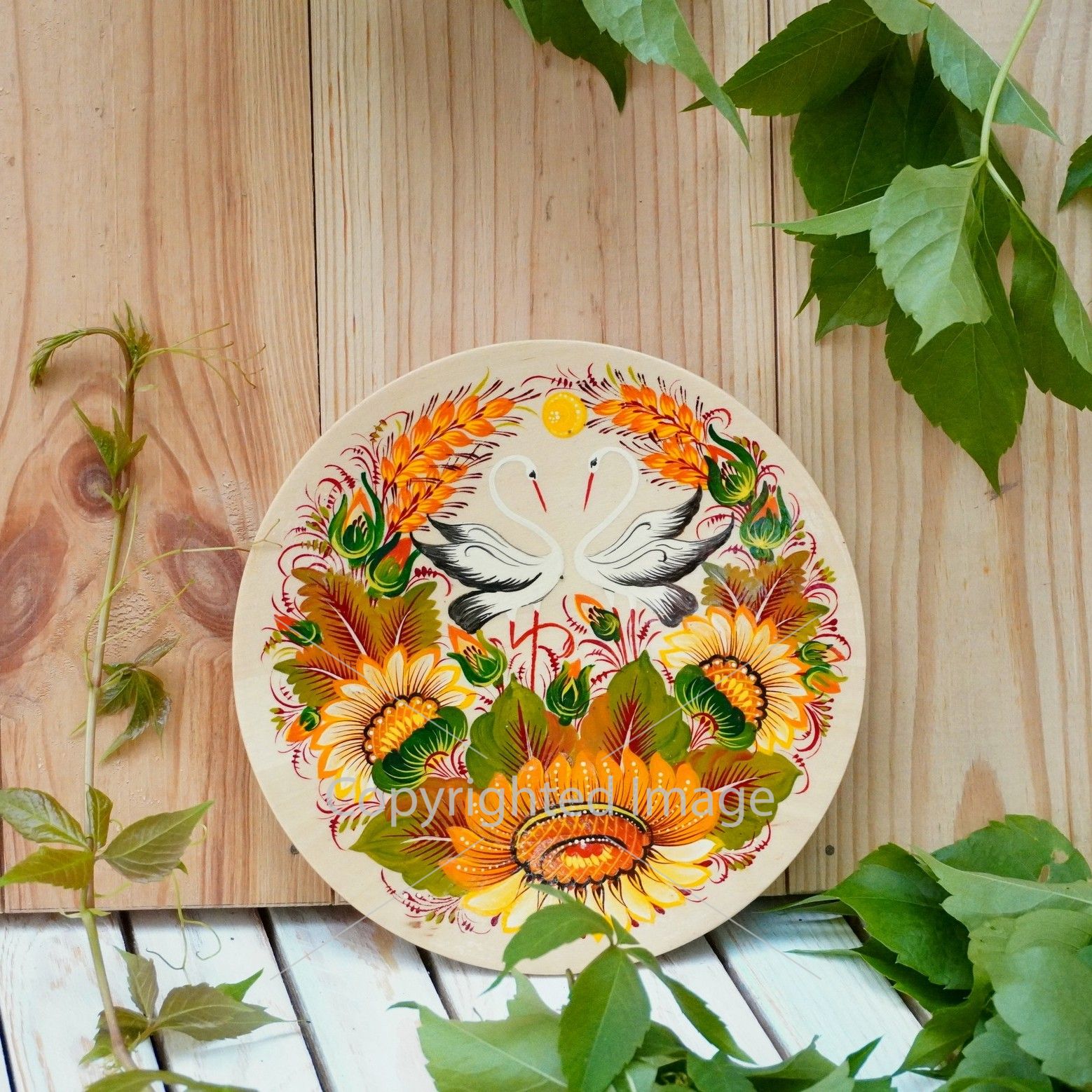 Тарелка с Петриковской росписью – это также оригинальный корпоративный сувенир, эксклюзивный подарок руководителю с национальными нотками. Мы можем сделать тарелку любого размера и расписать ее с учетом пожеланий заказчика.