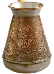 Кофеварки (Турки) изготовлены по уникальной технологии из листовой меди марки М1М (М2М) толщиной 1мм. При производстве кофеварок корпус соединяются с донышком методом припоя. После этого методом гравирования наносится рисунок по всей окружности корпуса.